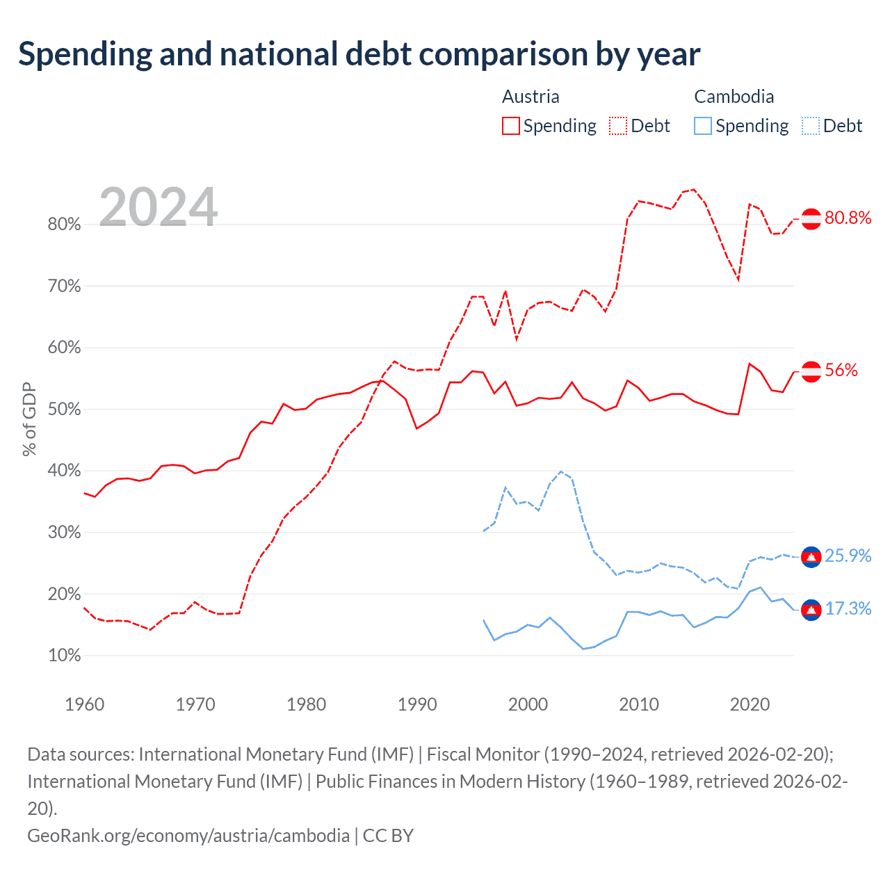 Austria has $432B in government debt (80.8% of GDP), compared to $12B (25.9% of GDP) in Cambodia.