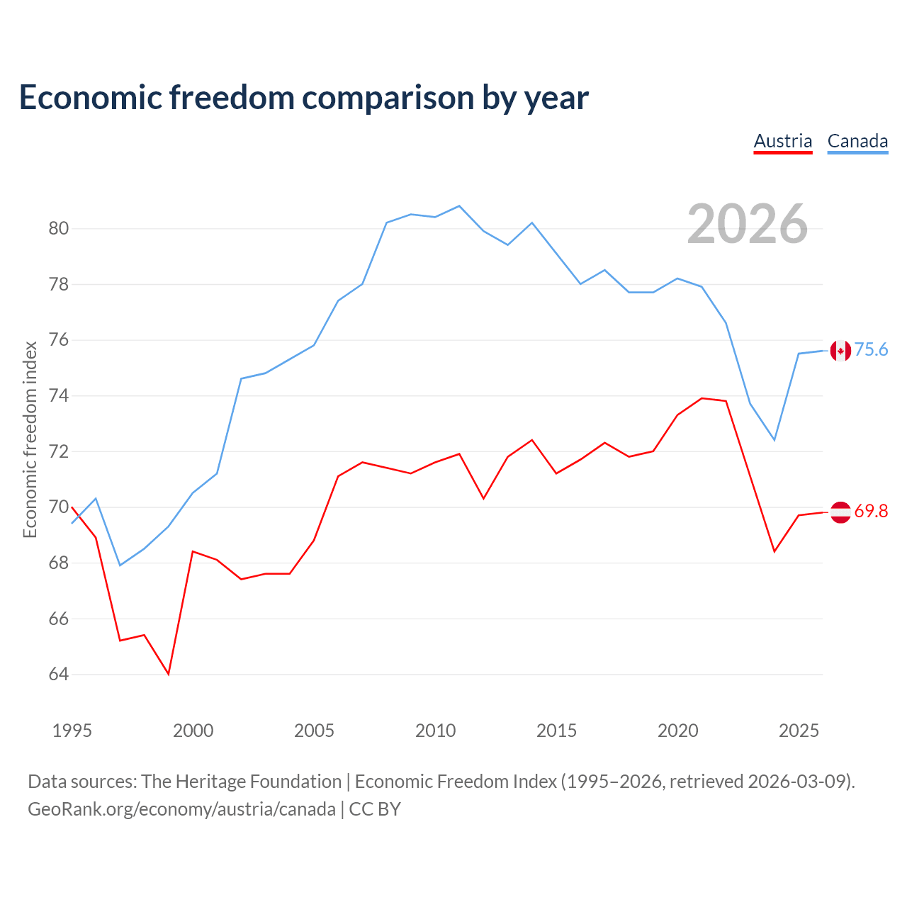Data sources: The Heritage Foundation | Economic Freedom Index (1995–2026, retrieved 2026-03-09).