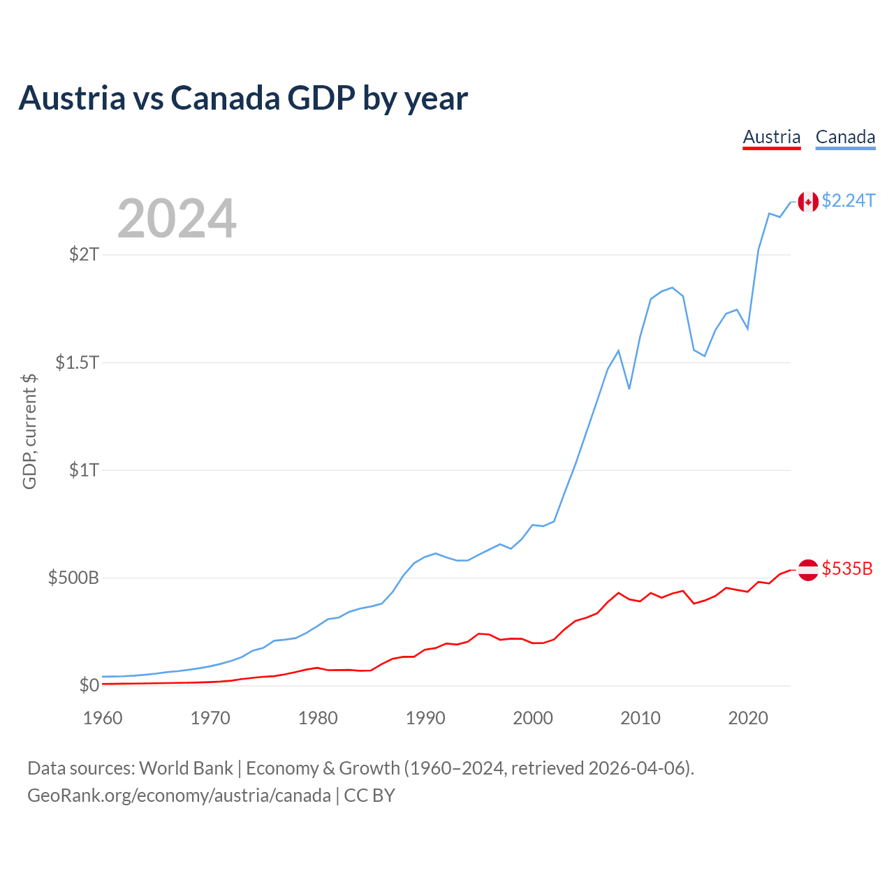 Austria vs Canada GDP by year