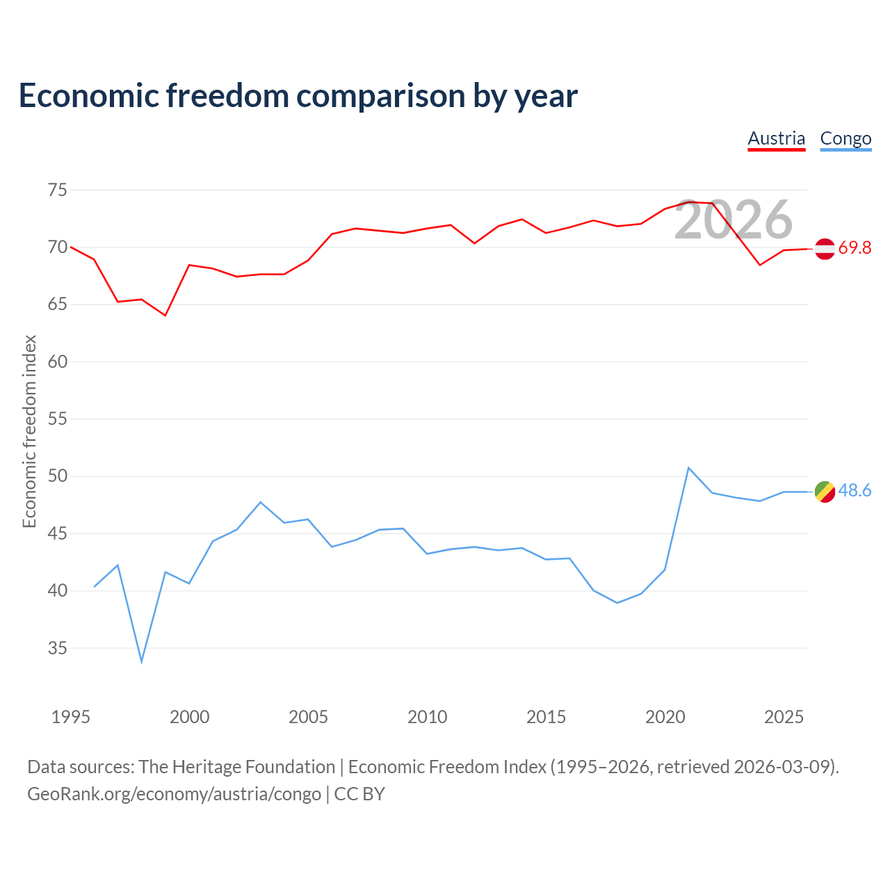 The Economic Freedom Index for Austria is 69.8, ranking 38/197, compared to 48.6 for the Congo, ranking 169/197. The chart above displays a comparison of annual changes in economic freedom indexes.