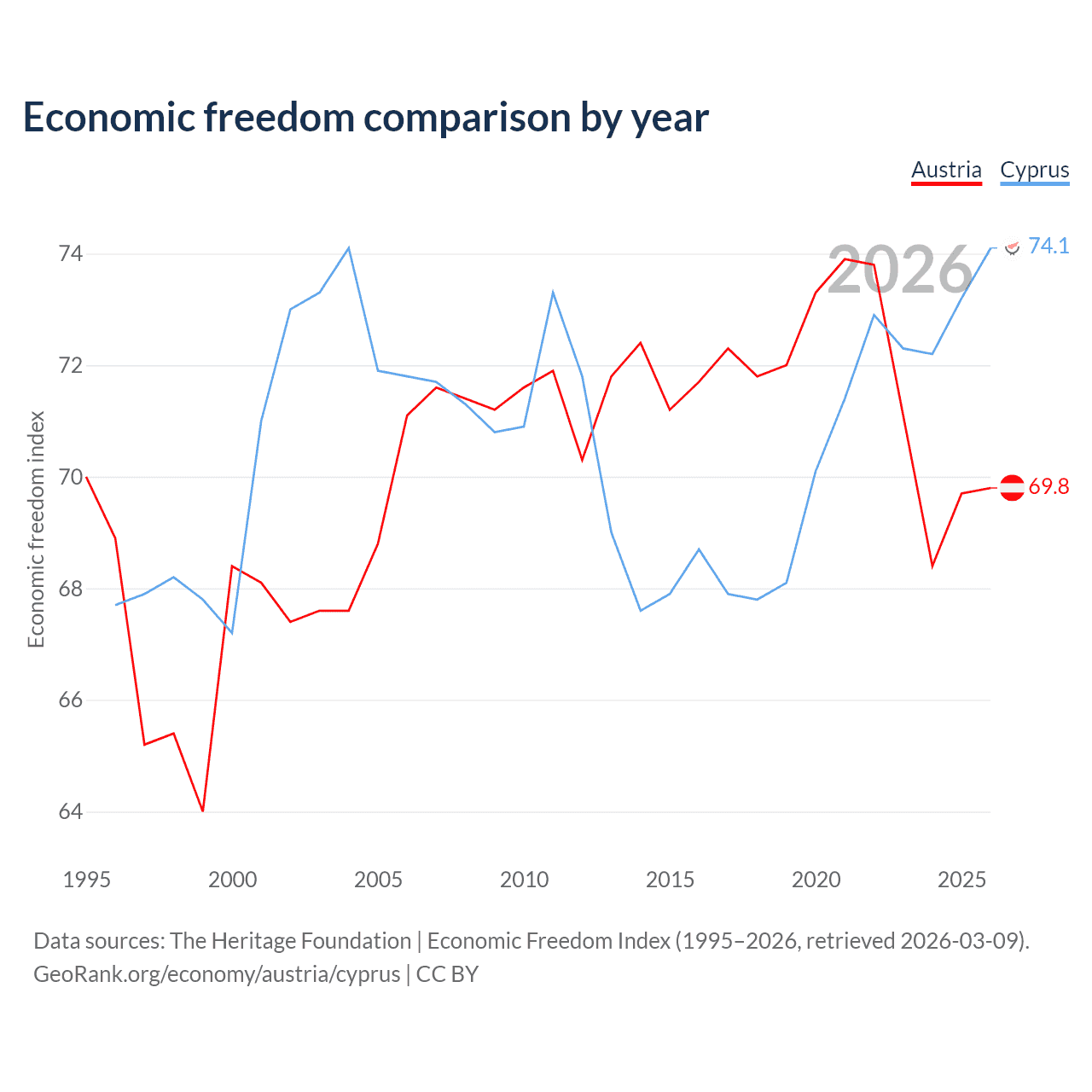 The Economic Freedom Index for Austria is 69.8, ranking 38/197, compared to 74.1 for Cyprus, ranking 21/197. The chart above displays a comparison of annual changes in economic freedom indexes.