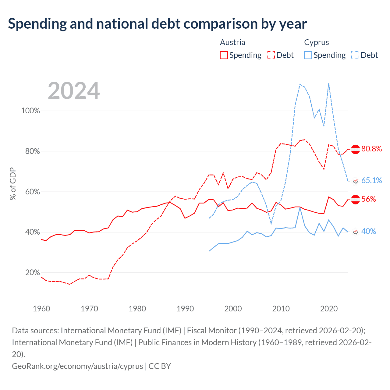 Austria has $432B in government debt (80.8% of GDP), compared to $24.5B (65.1% of GDP) in Cyprus.