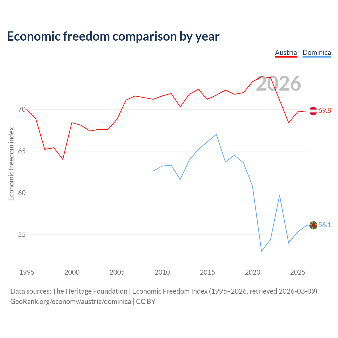 The Economic Freedom Index for Austria is 69.8, ranking 38/197, compared to 56.1 for Dominica, ranking 124/197. The chart above displays a comparison of annual changes in economic freedom indexes.