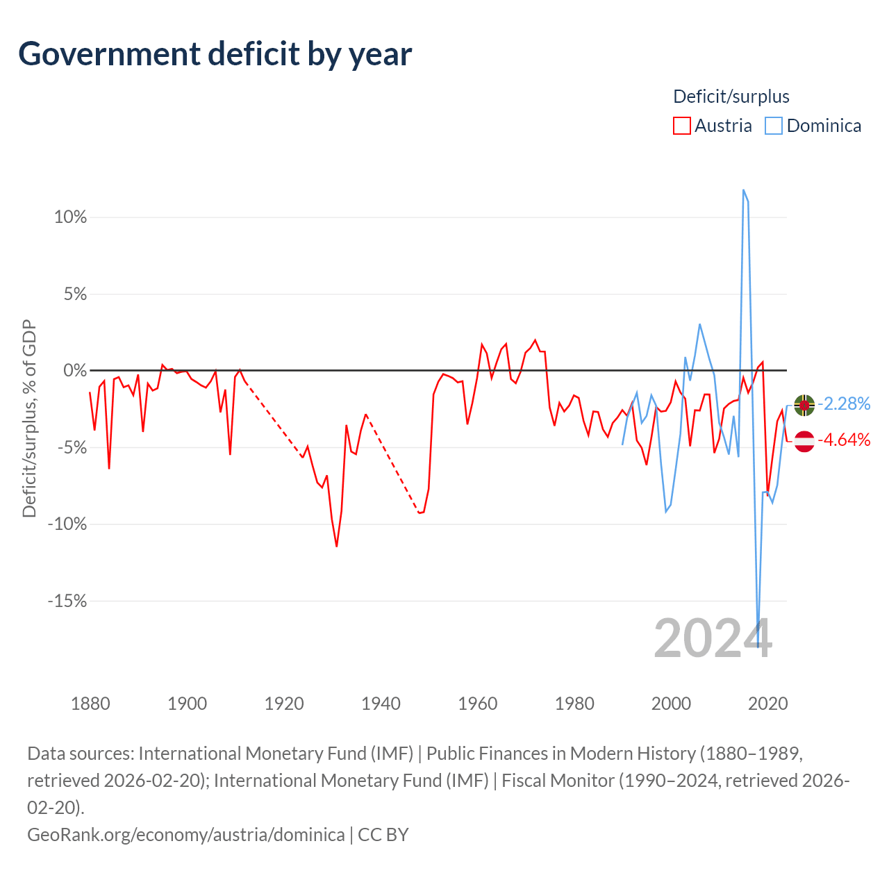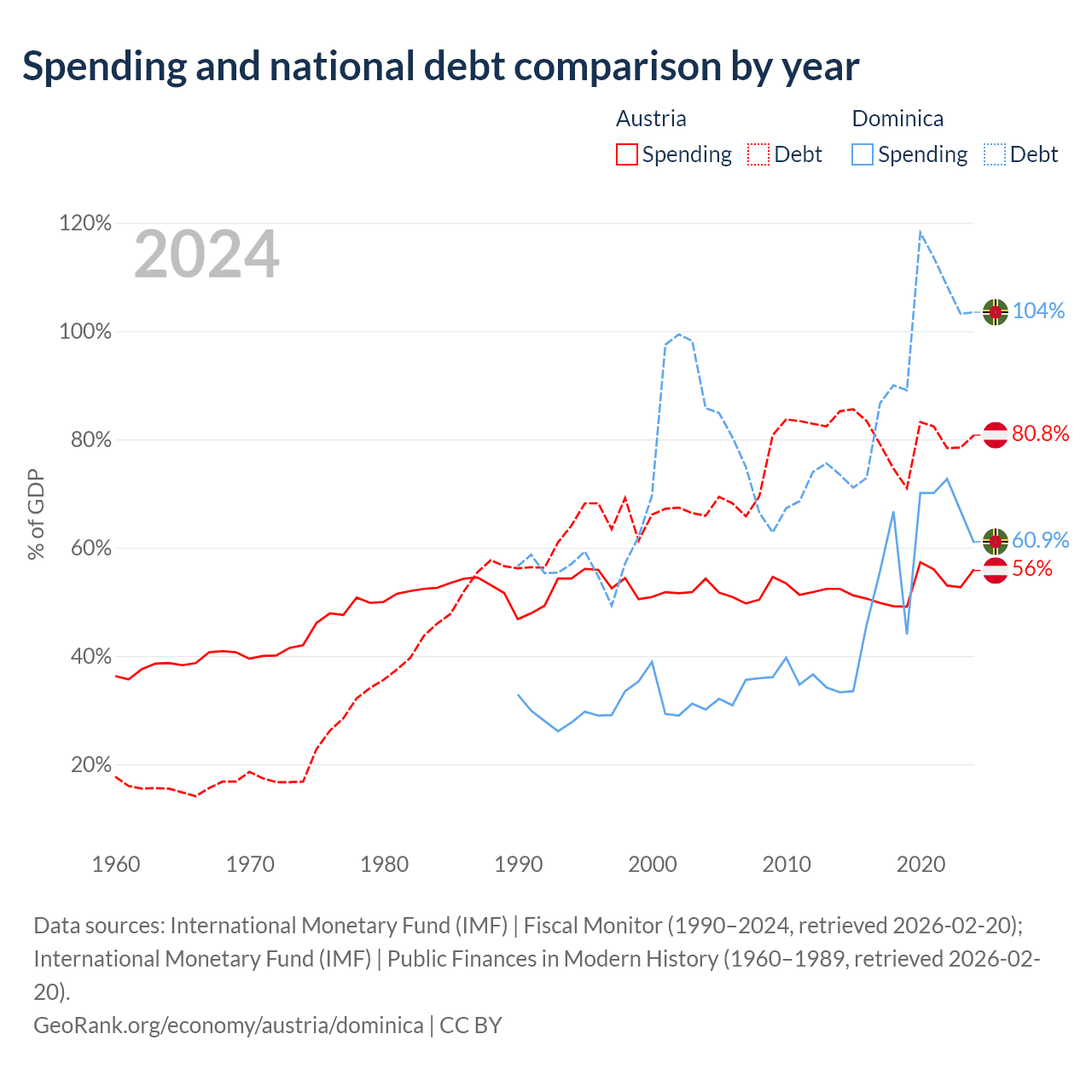 Austria has $432B in government debt (80.8% of GDP), compared to $713M (103.5% of GDP) in Dominica.