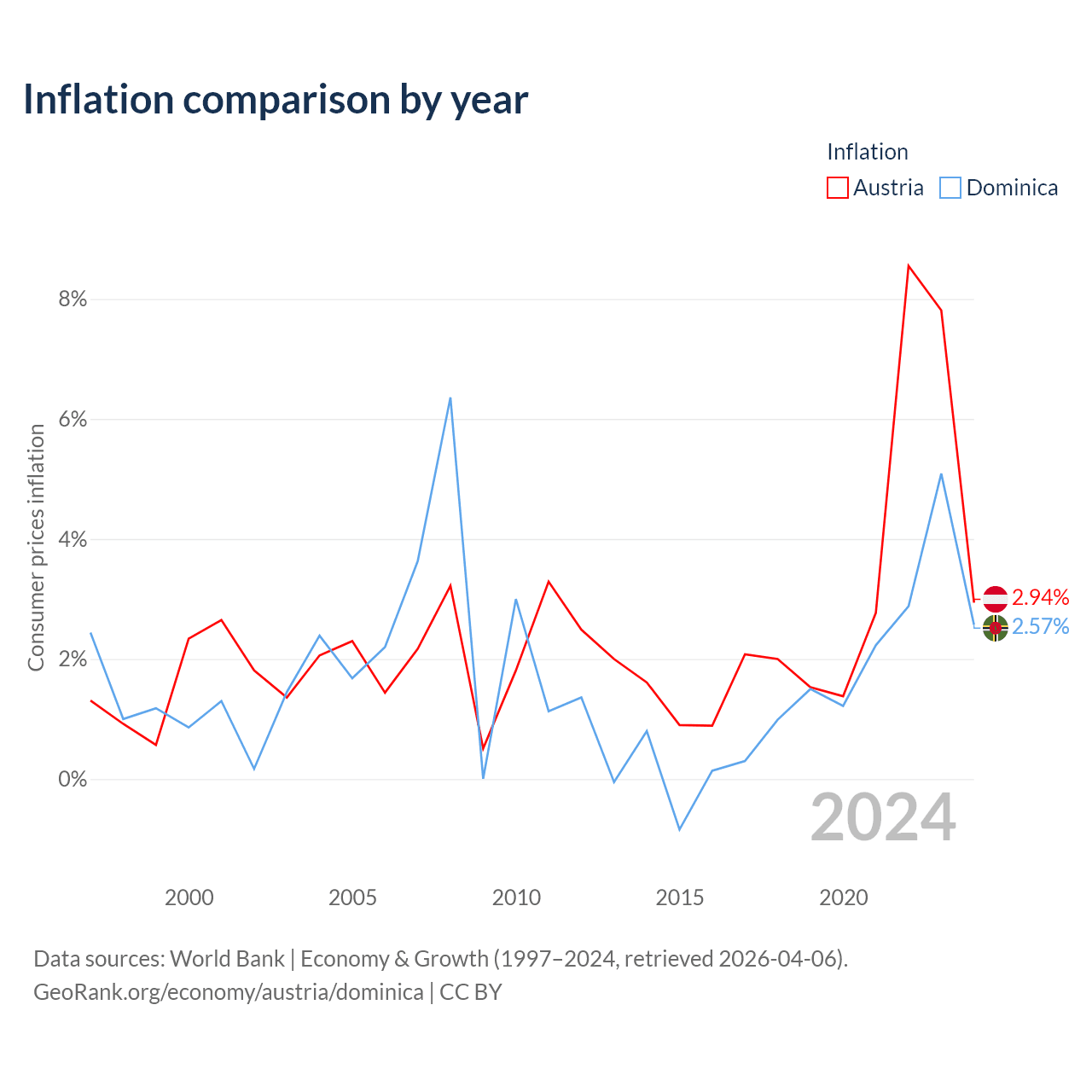 Austria has a GDP of $535B compared to $689M for Dominica, ranking 30/197 and 190/197 by economy size, respectively.