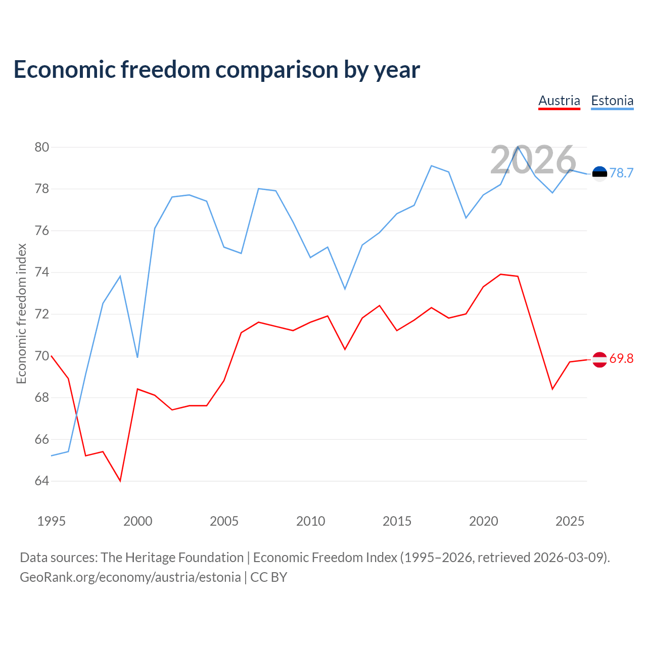 The Economic Freedom Index for Austria is 69.8, ranking 38/197, compared to 78.7 for Estonia, ranking 10/197. The chart above displays a comparison of annual changes in economic freedom indexes.