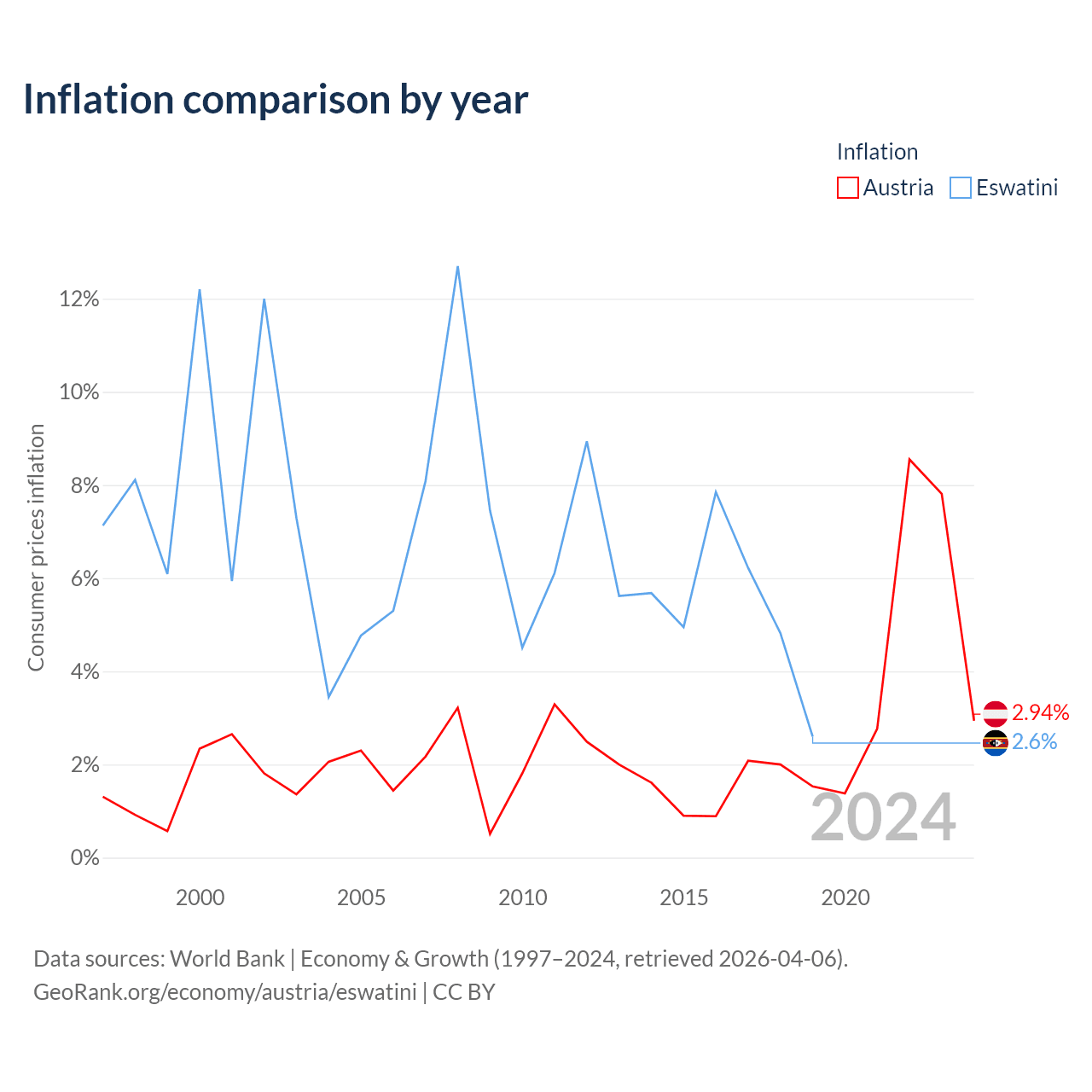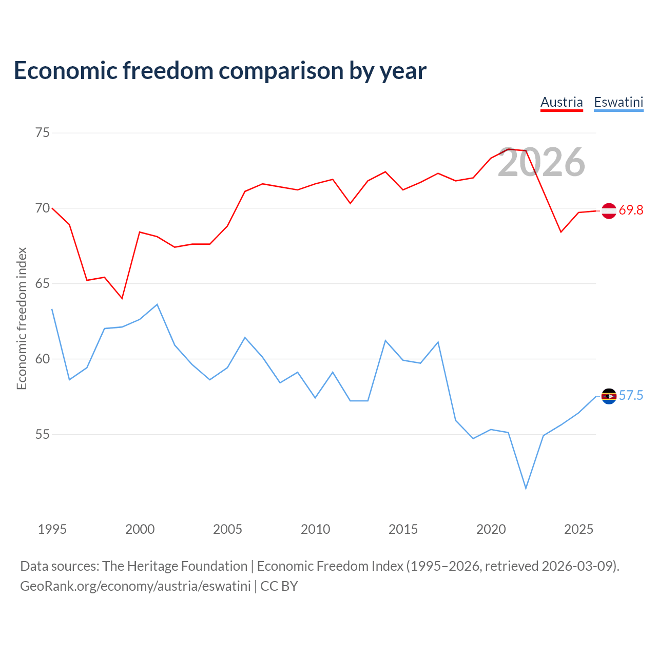 The Economic Freedom Index for Austria is 69.8, ranking 38/197, compared to 57.5 for Eswatini, ranking 116/197. The chart above displays a comparison of annual changes in economic freedom indexes.