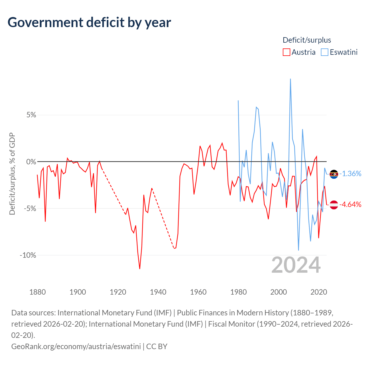 Austria has $432B in government debt (80.8% of GDP), compared to $1.93B (39.8% of GDP) in Eswatini.