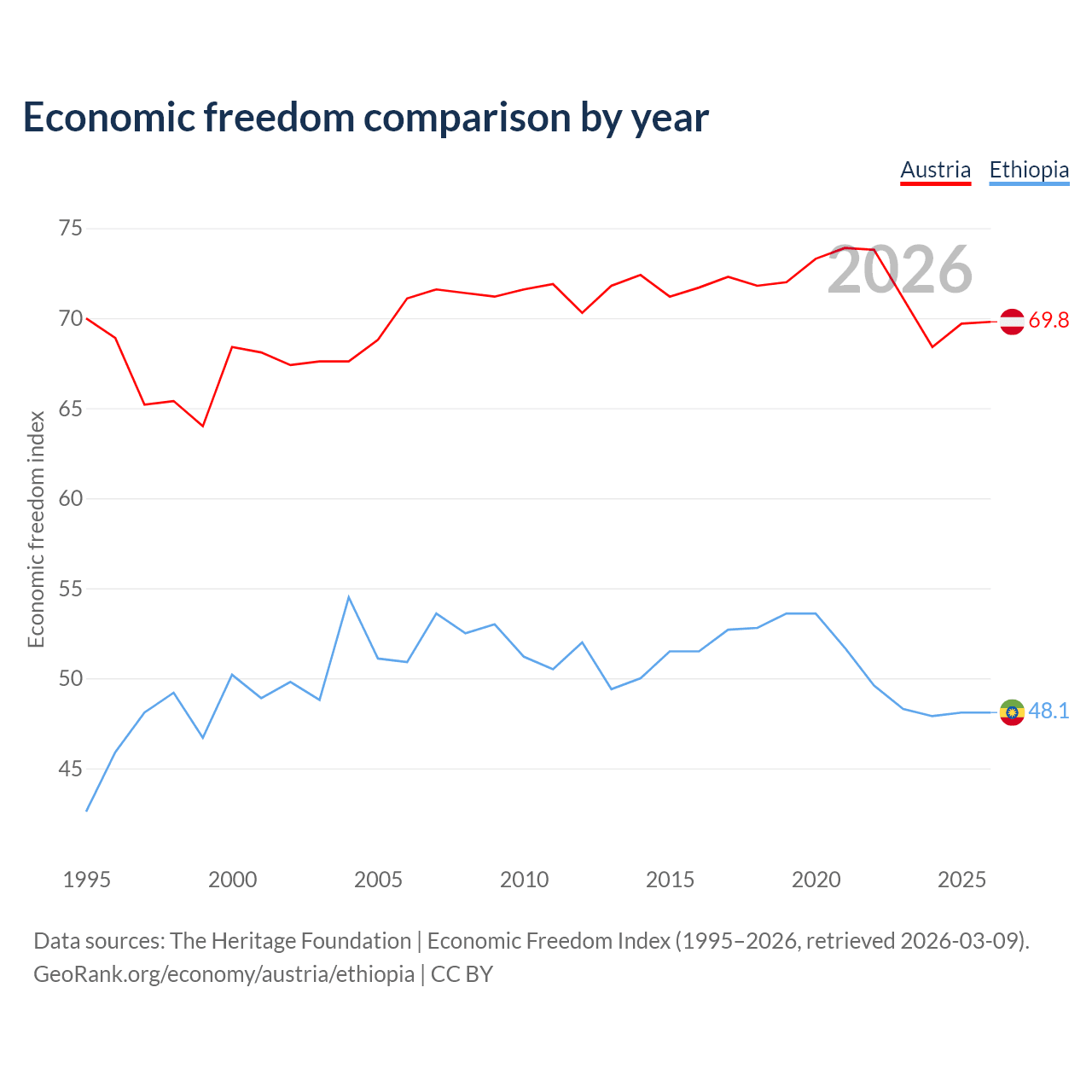 The Economic Freedom Index for Austria is 69.8, ranking 38/197, compared to 48.1 for Ethiopia, ranking 171/197. The chart above displays a comparison of annual changes in economic freedom indexes.