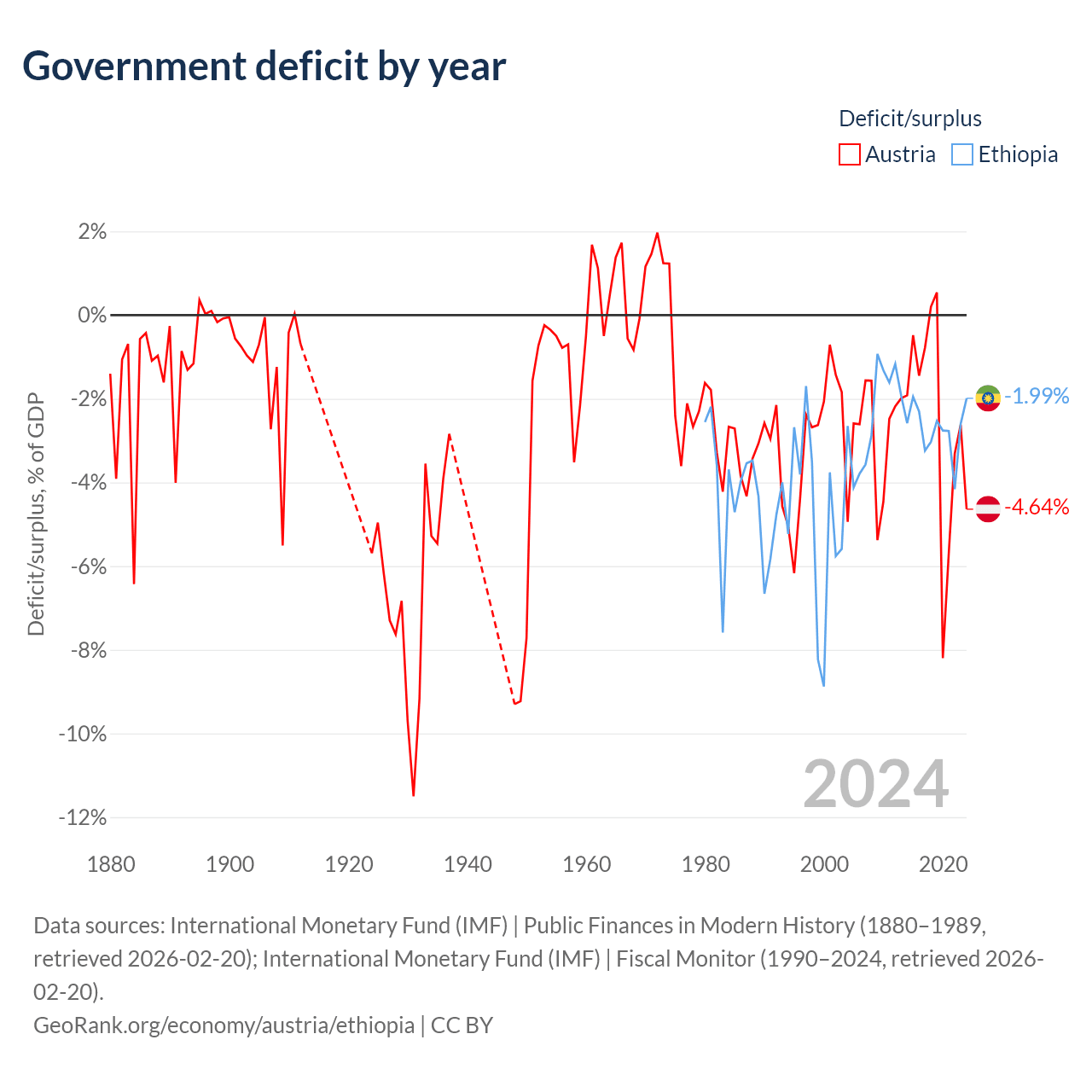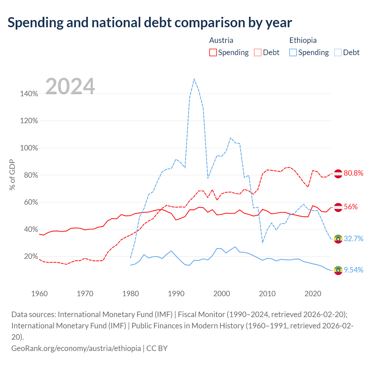 Austria has $432B in government debt (80.8% of GDP), compared to $48.9B (32.7% of GDP) in Ethiopia.