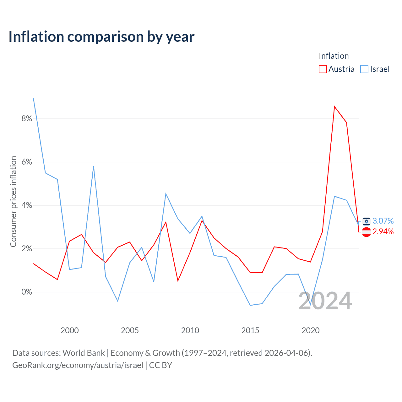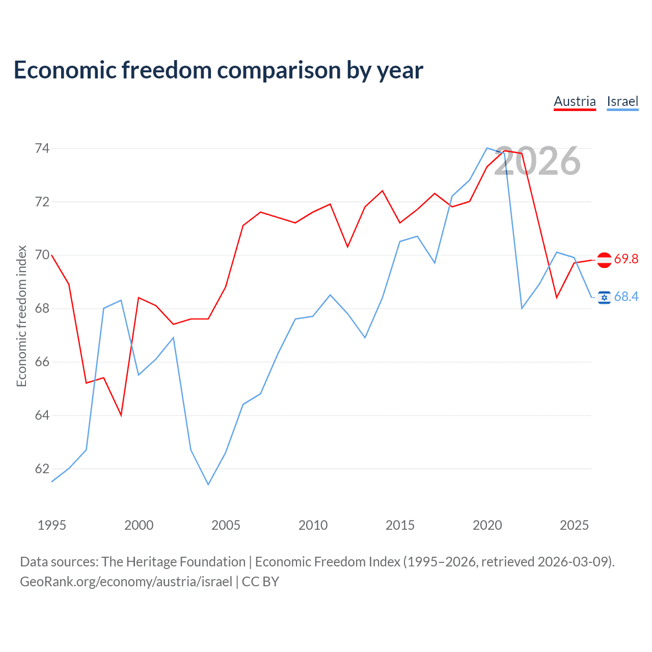The Economic Freedom Index for Austria is 69.8, ranking 38/197, compared to 68.4 for Israel, ranking 47/197. The chart above displays a comparison of annual changes in economic freedom indexes.