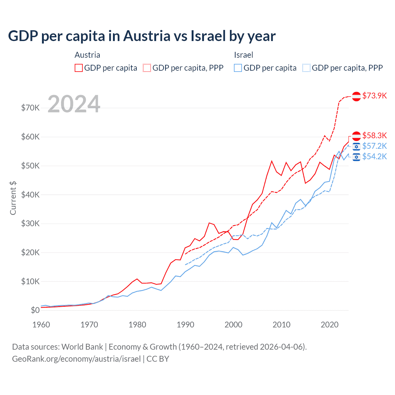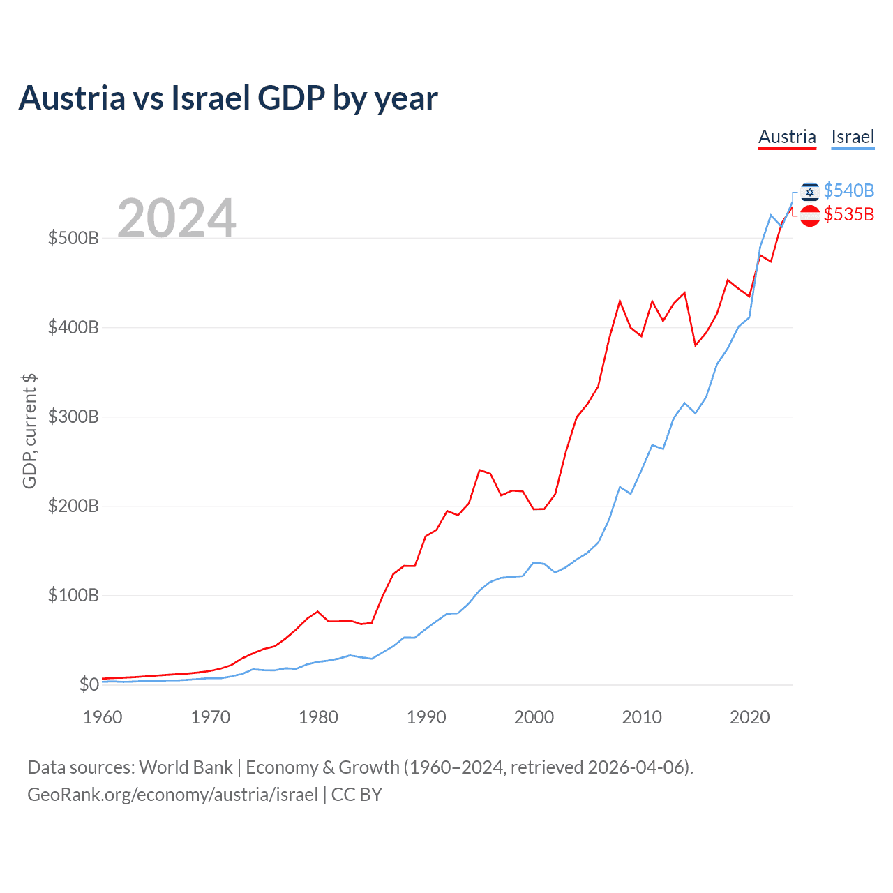 Austria has a GDP of $535B compared to $540B for Israel, ranking 30/197 and 29/197 by economy size, respectively.