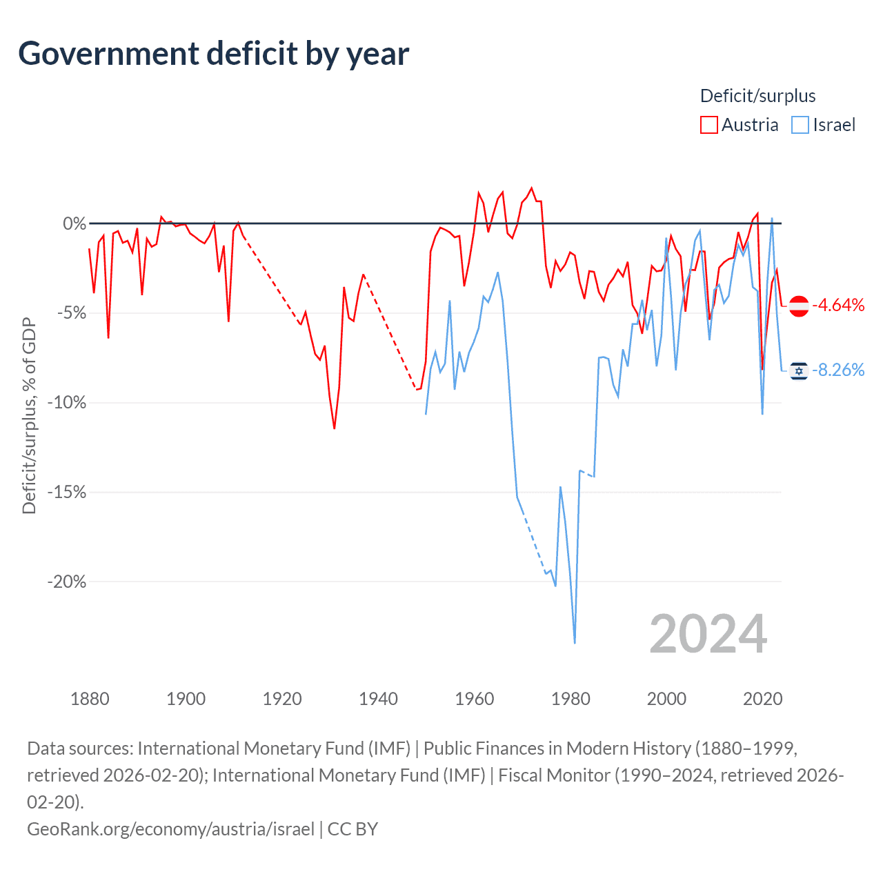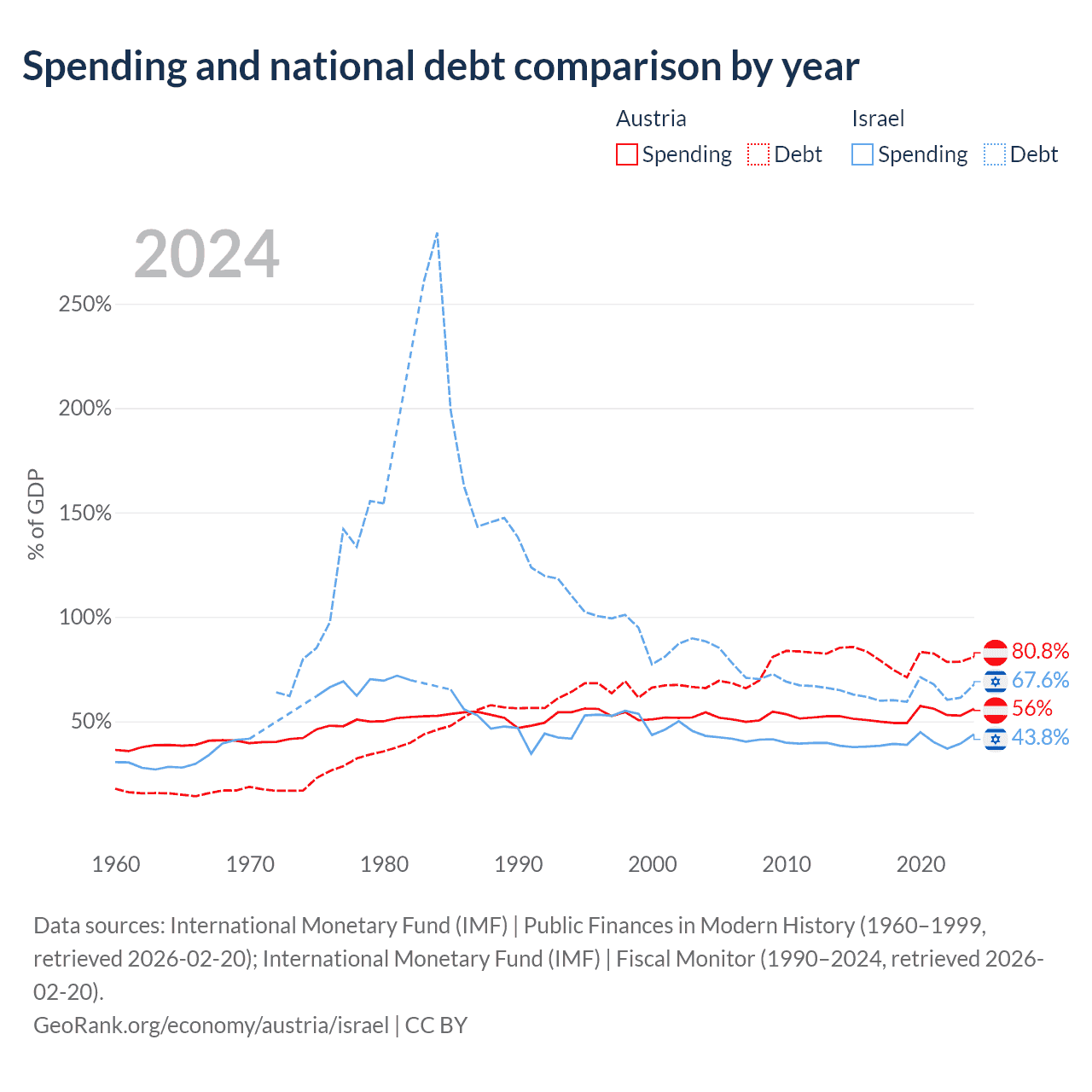 Austria has $432B in government debt (80.8% of GDP), compared to $366B (67.6% of GDP) in Israel.
