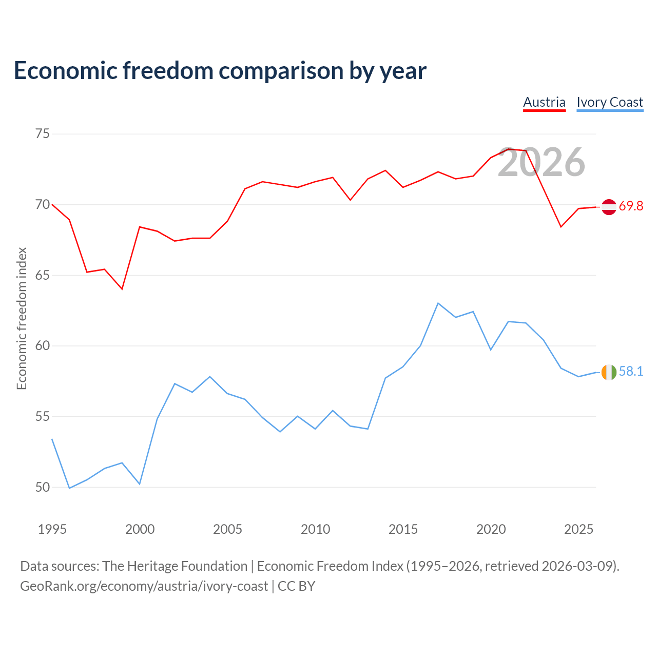 The Economic Freedom Index for Austria is 69.8, ranking 38/197, compared to 58.1 for Ivory Coast, ranking 111/197. The chart above displays a comparison of annual changes in economic freedom indexes.