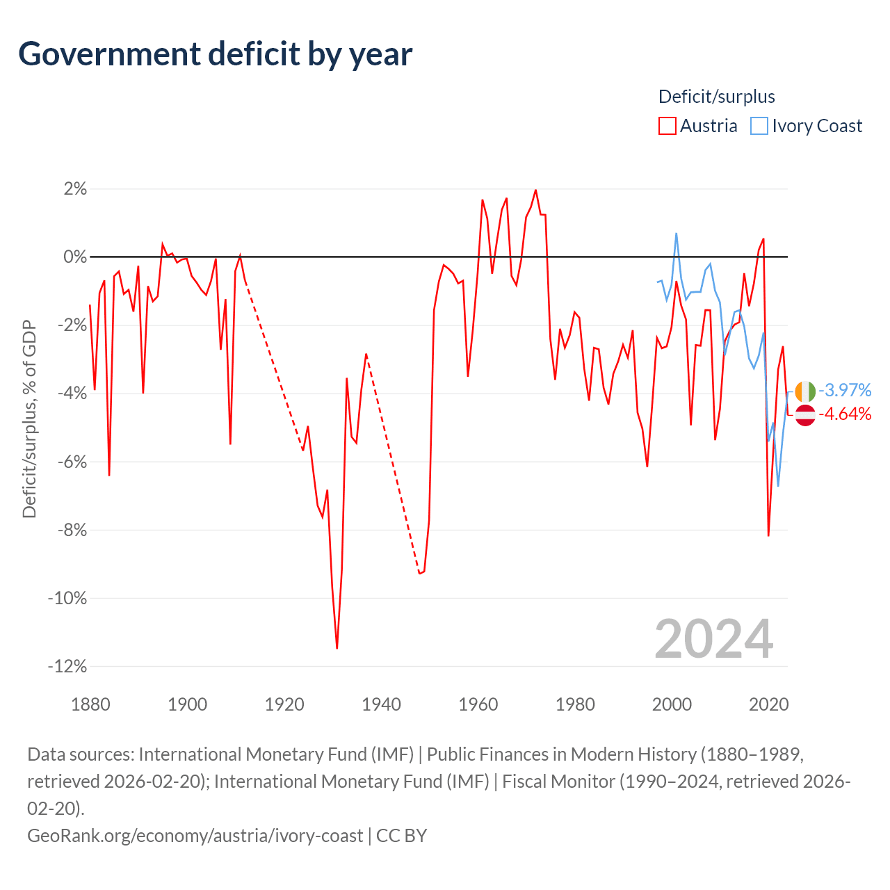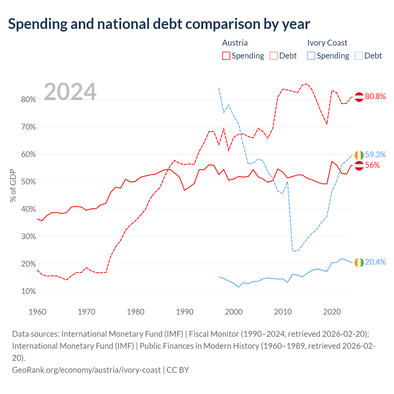 Austria has $432B in government debt (80.8% of GDP), compared to $51.6B (59.3% of GDP) in Ivory Coast.