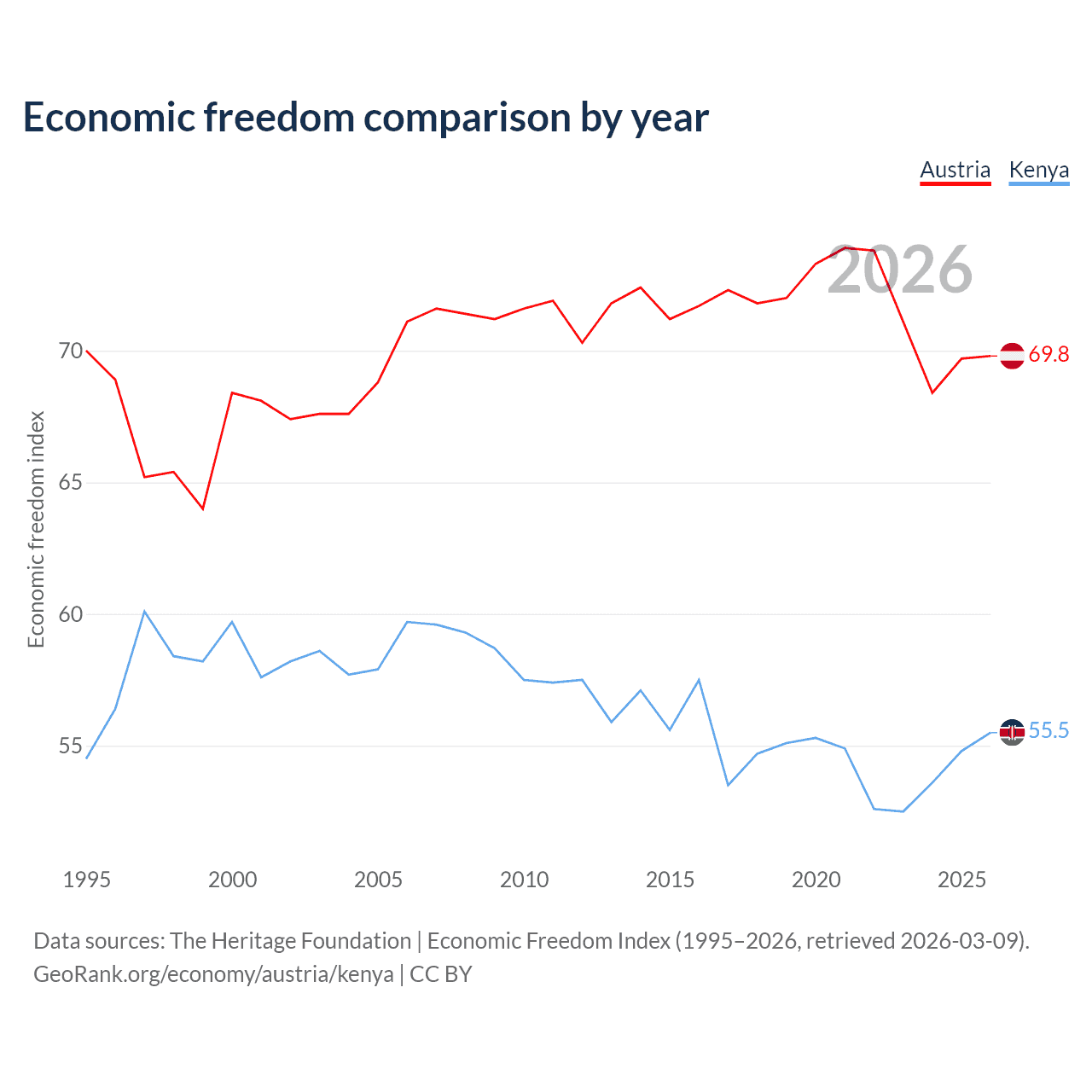 The Economic Freedom Index for Austria is 69.8, ranking 38/197, compared to 55.5 for Kenya, ranking 128/197. The chart above displays a comparison of annual changes in economic freedom indexes.