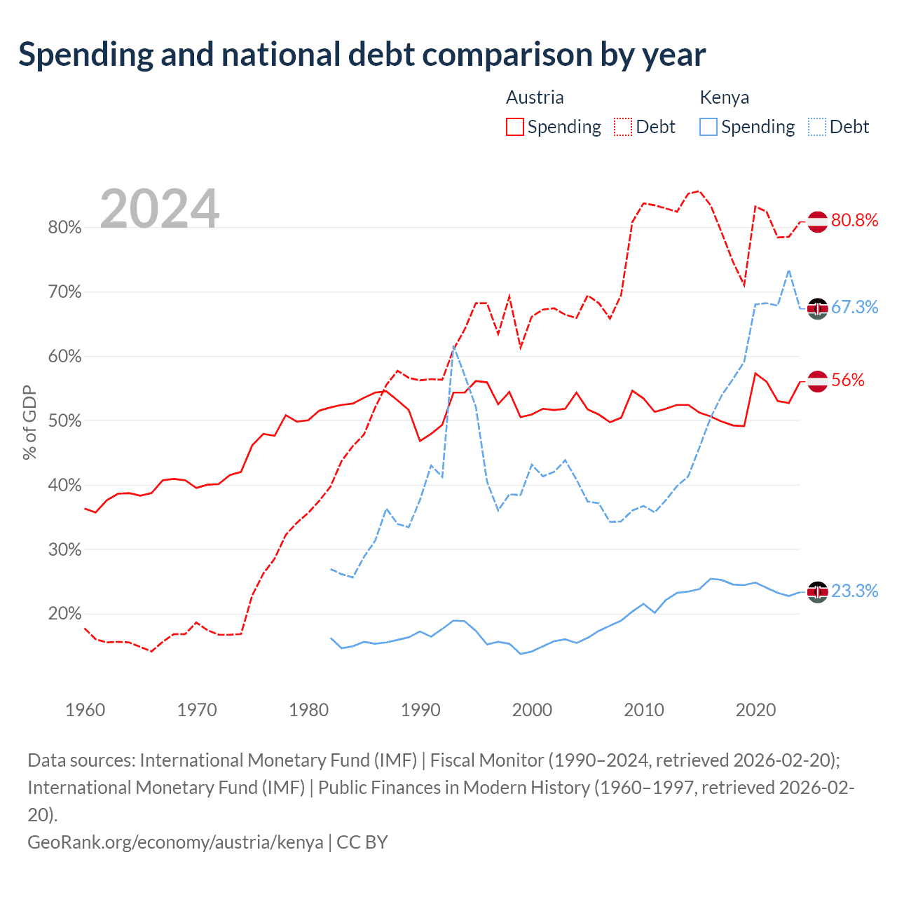 Austria has $432B in government debt (80.8% of GDP), compared to $81B (67.3% of GDP) in Kenya.
