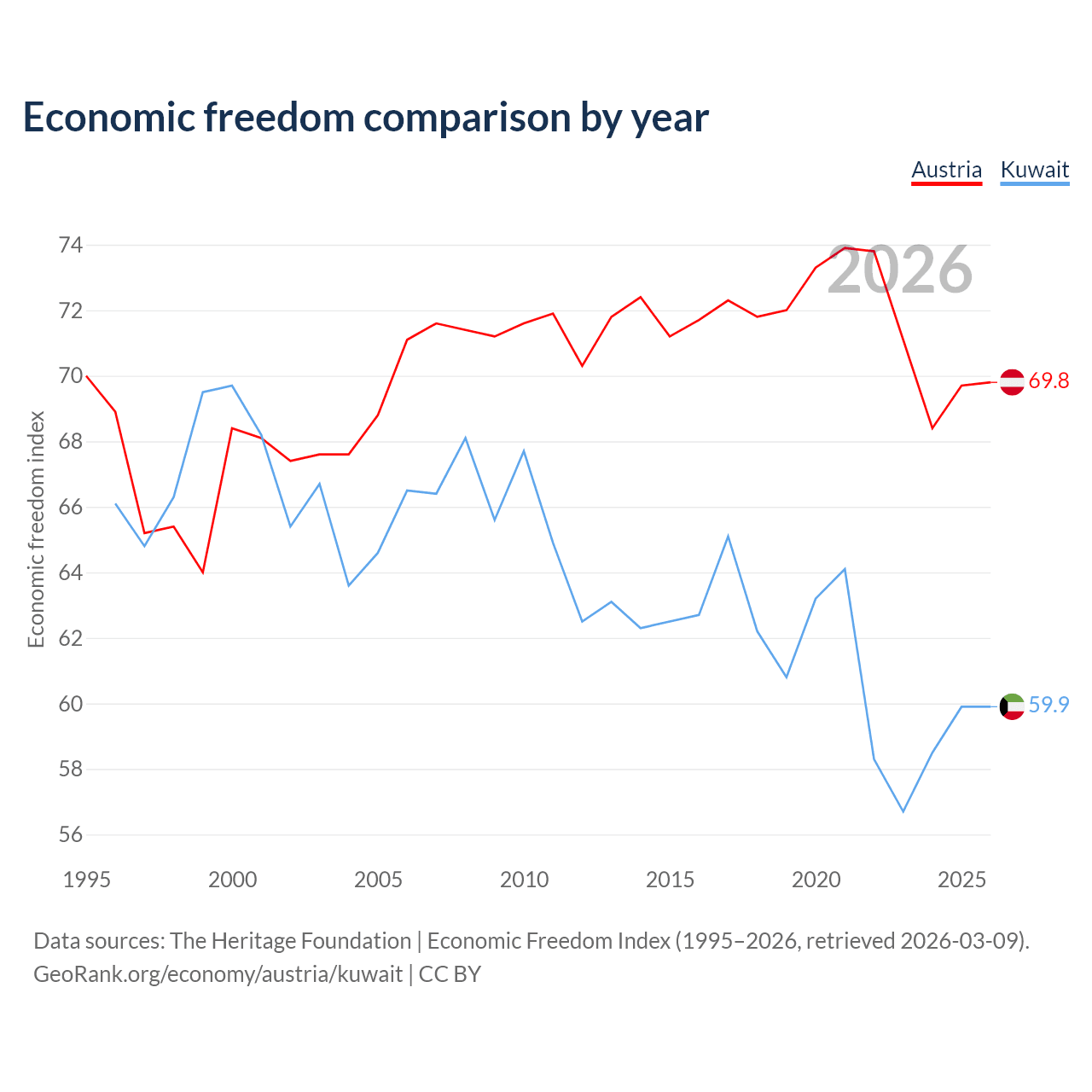 The Economic Freedom Index for Austria is 69.8, ranking 38/197, compared to 59.9 for Kuwait, ranking 100/197. The chart above displays a comparison of annual changes in economic freedom indexes.