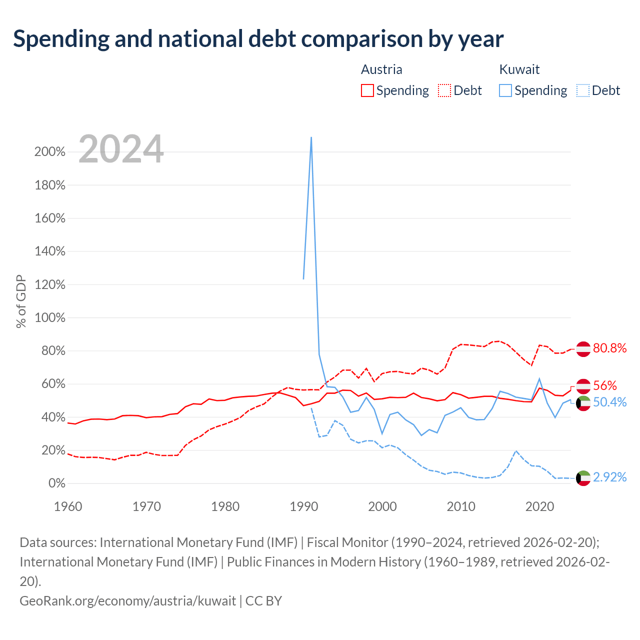 Austria has $432B in government debt (80.8% of GDP), compared to $4.68B (2.92% of GDP) in Kuwait.