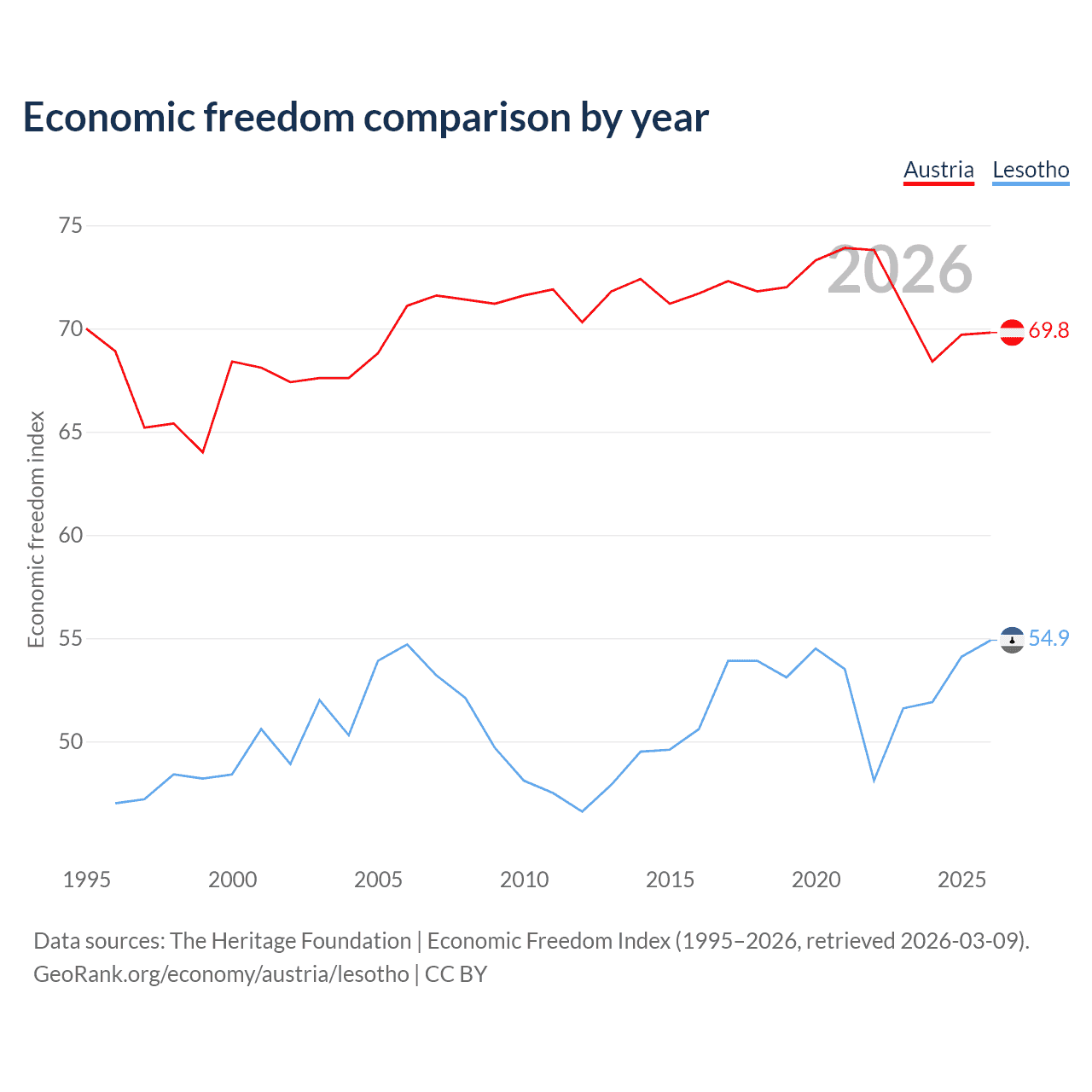 The Economic Freedom Index for Austria is 69.8, ranking 38/197, compared to 54.9 for Lesotho, ranking 130/197. The chart above displays a comparison of annual changes in economic freedom indexes.