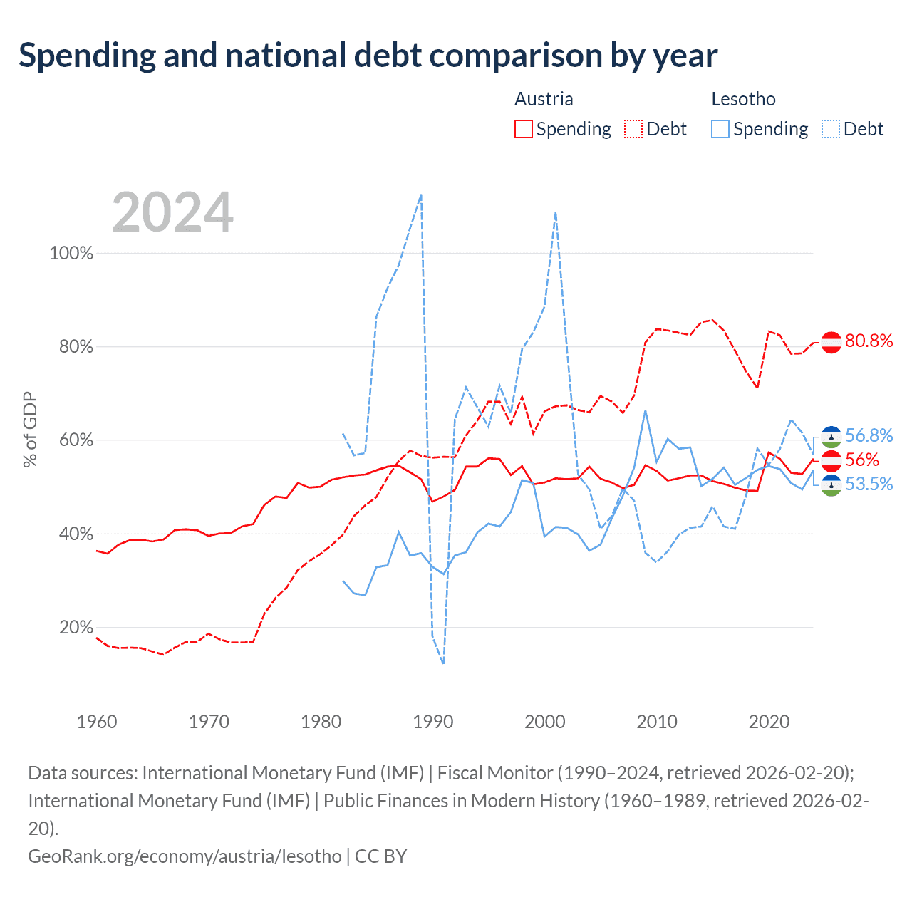 Austria has $432B in government debt (80.8% of GDP), compared to $1.29B (56.8% of GDP) in Lesotho.