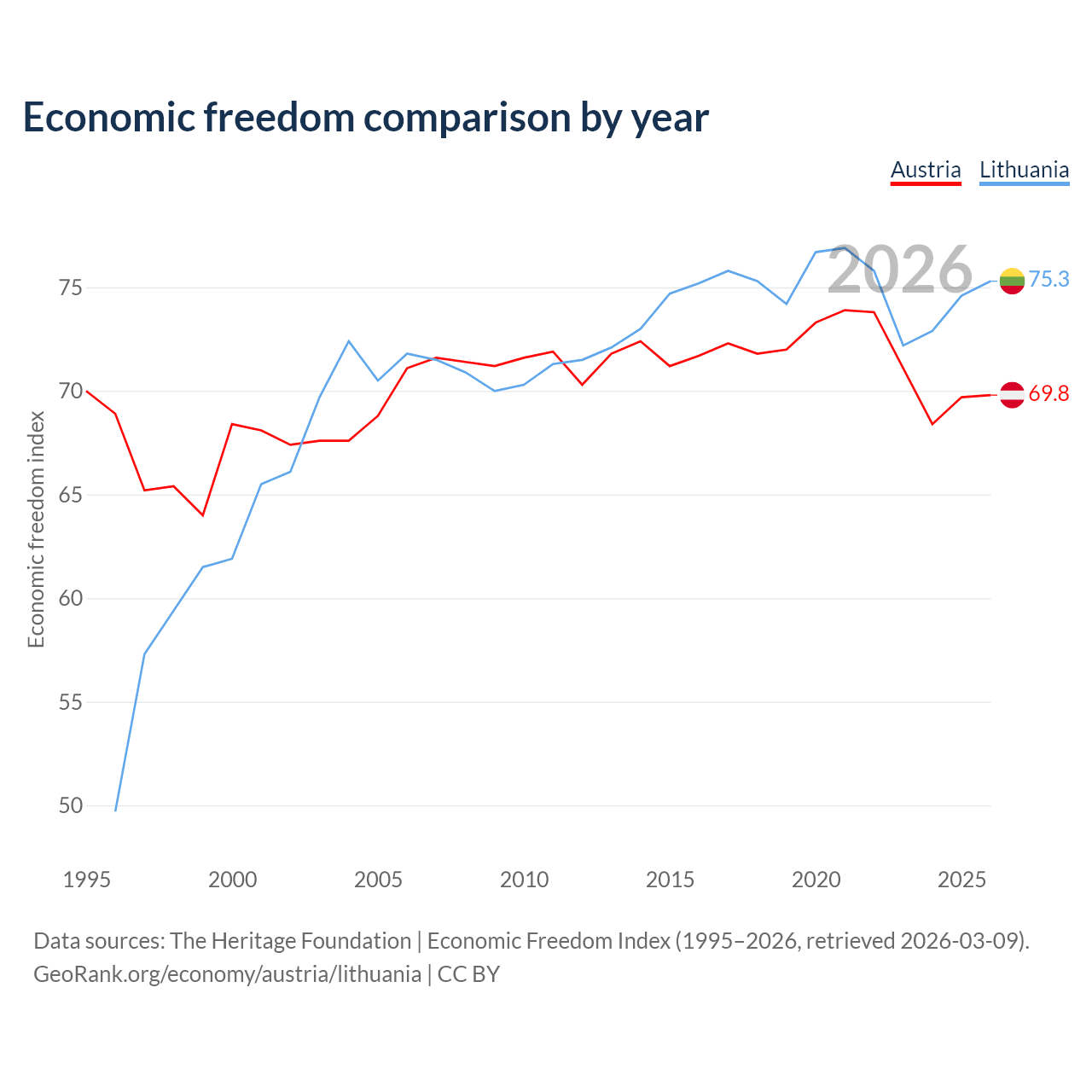 The Economic Freedom Index for Austria is 69.8, ranking 38/197, compared to 75.3 for Lithuania, ranking 18/197. The chart above displays a comparison of annual changes in economic freedom indexes.