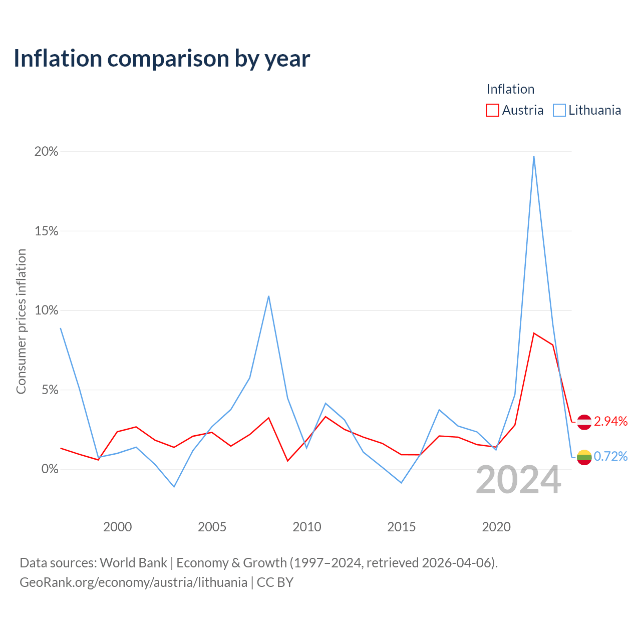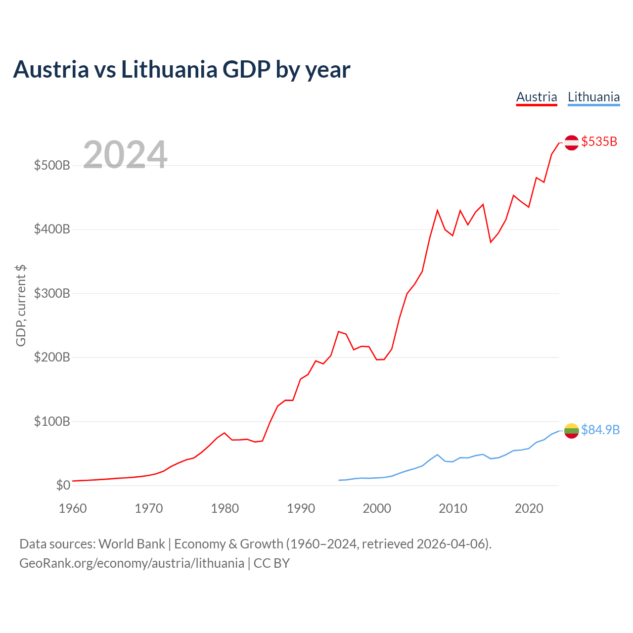Austria has a GDP of $535B compared to $84.9B for Lithuania, ranking 30/197 and 79/197 by economy size, respectively.