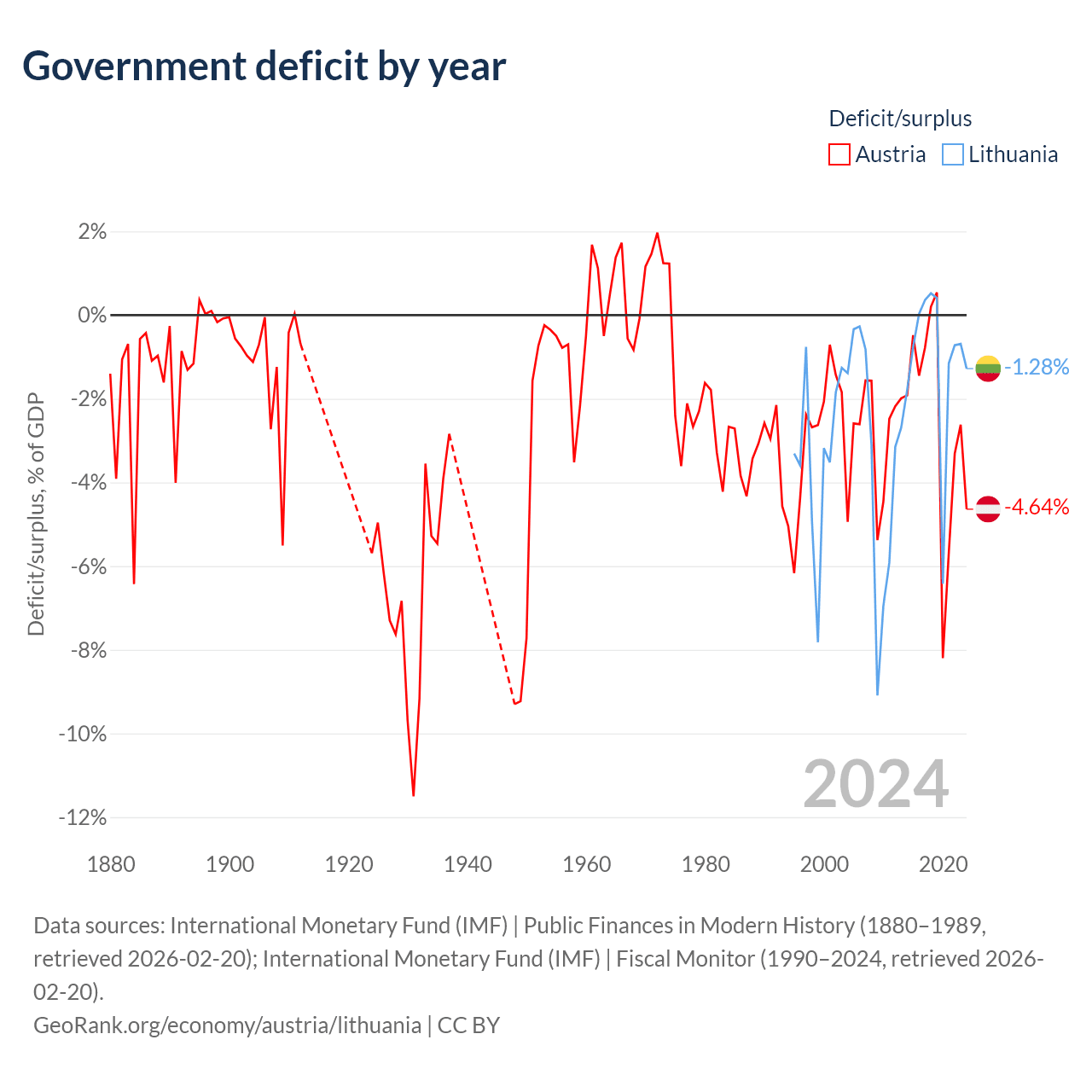 Austria has $432B in government debt (80.8% of GDP), compared to $32.4B (38.2% of GDP) in Lithuania.