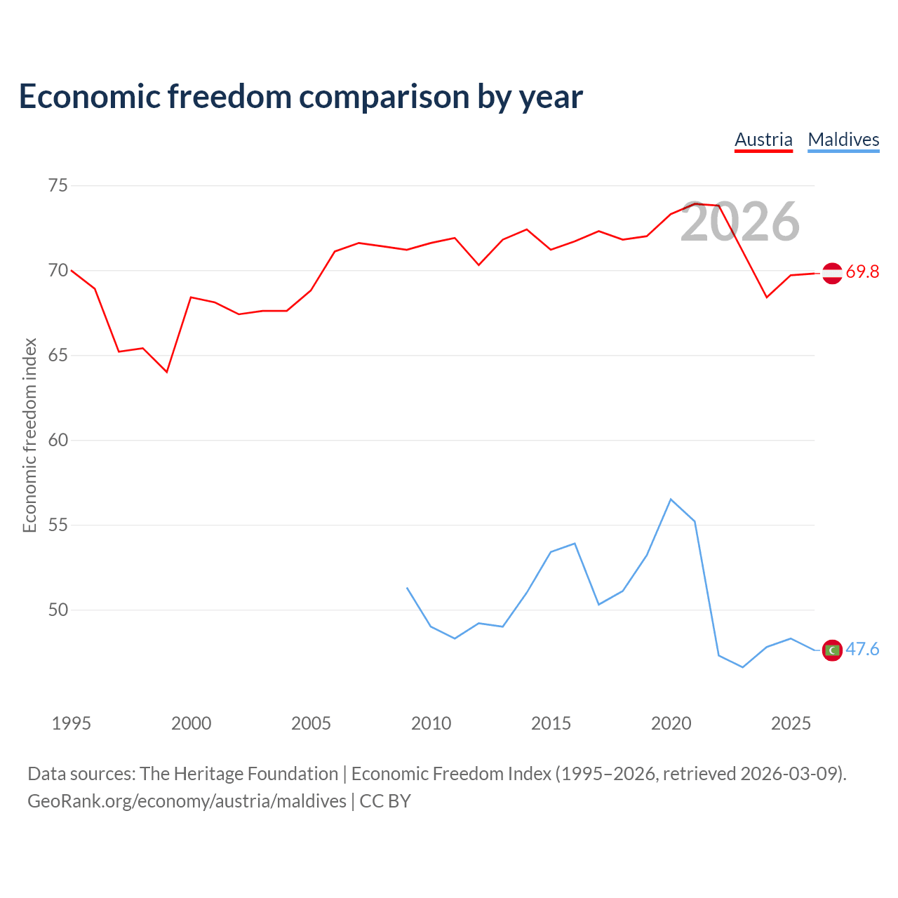 The Economic Freedom Index for Austria is 69.8, ranking 38/197, compared to 47.6 for Maldives, ranking 174/197. The chart above displays a comparison of annual changes in economic freedom indexes.