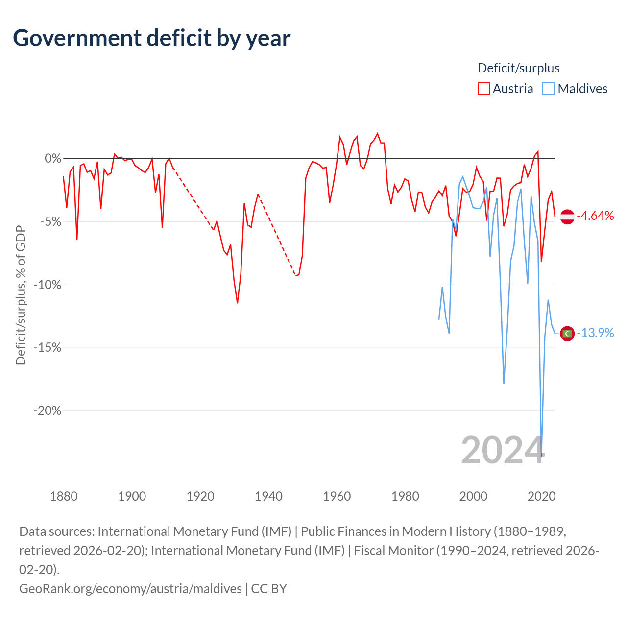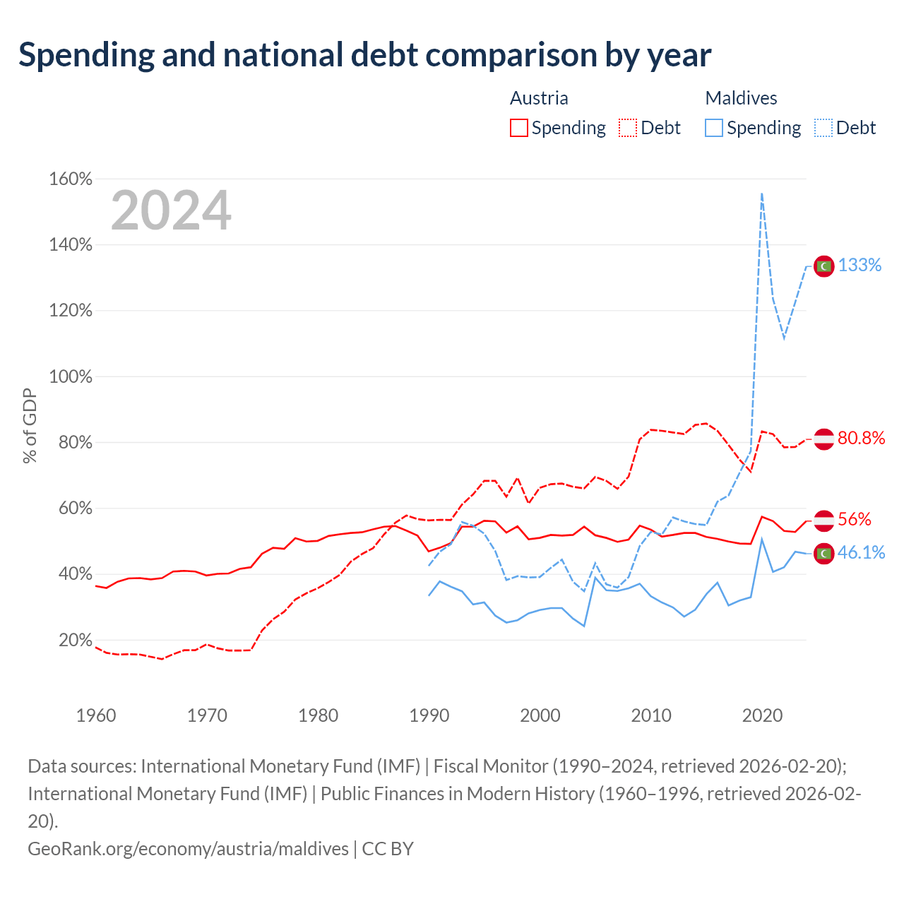 Austria has $432B in government debt (80.8% of GDP), compared to $9.41B (133.3% of GDP) in Maldives.