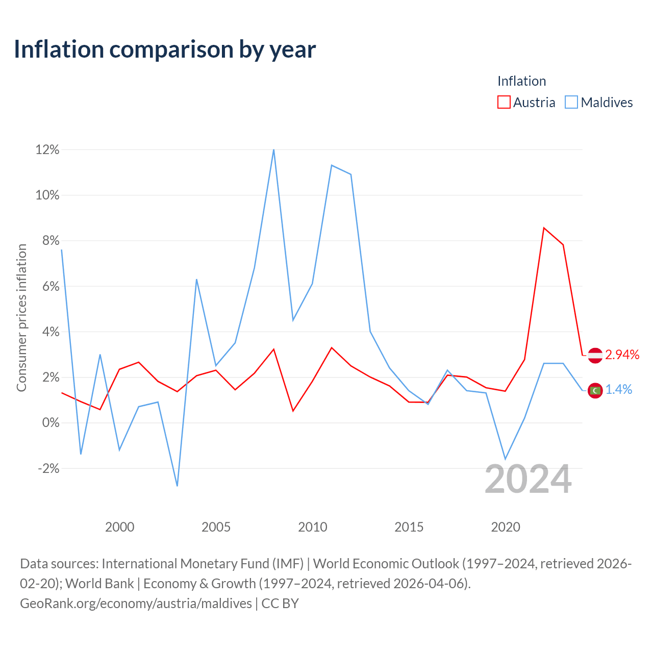 Austria has a GDP of $535B compared to $7.06B for Maldives, ranking 30/197 and 159/197 by economy size, respectively.