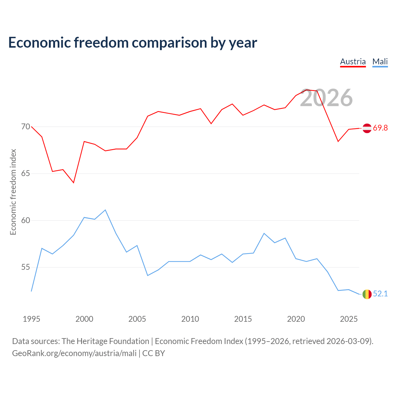 The Economic Freedom Index for Austria is 69.8, ranking 38/197, compared to 52.1 for Mali, ranking 150/197. The chart above displays a comparison of annual changes in economic freedom indexes.