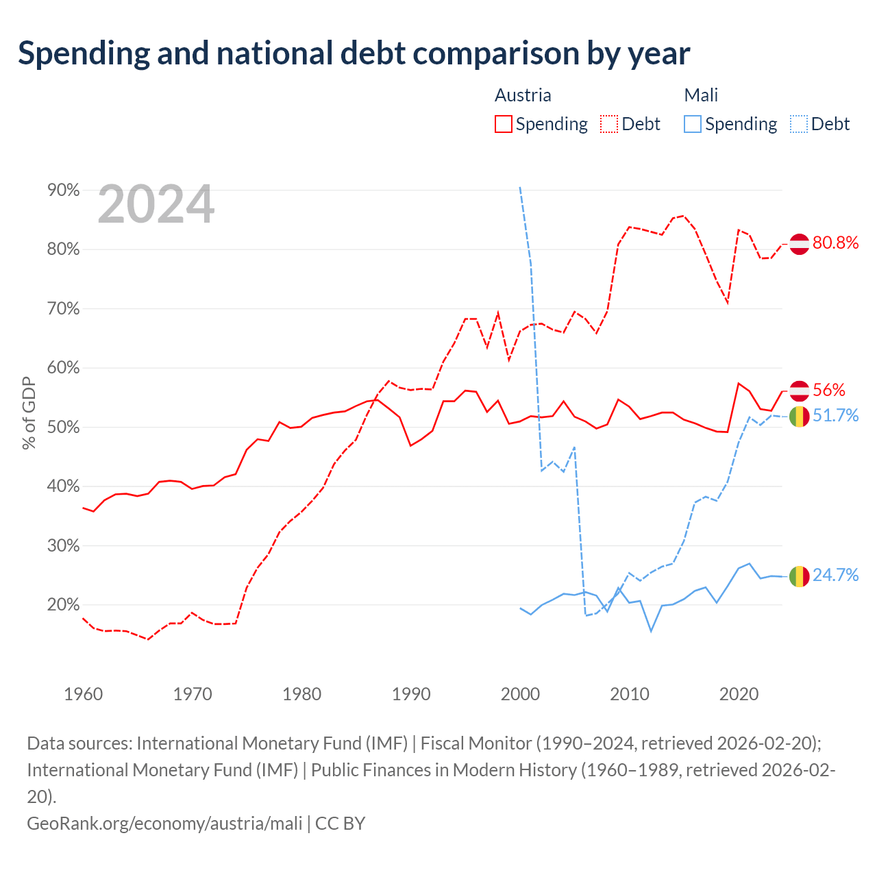 Austria has $432B in government debt (80.8% of GDP), compared to $13.9B (51.7% of GDP) in Mali.