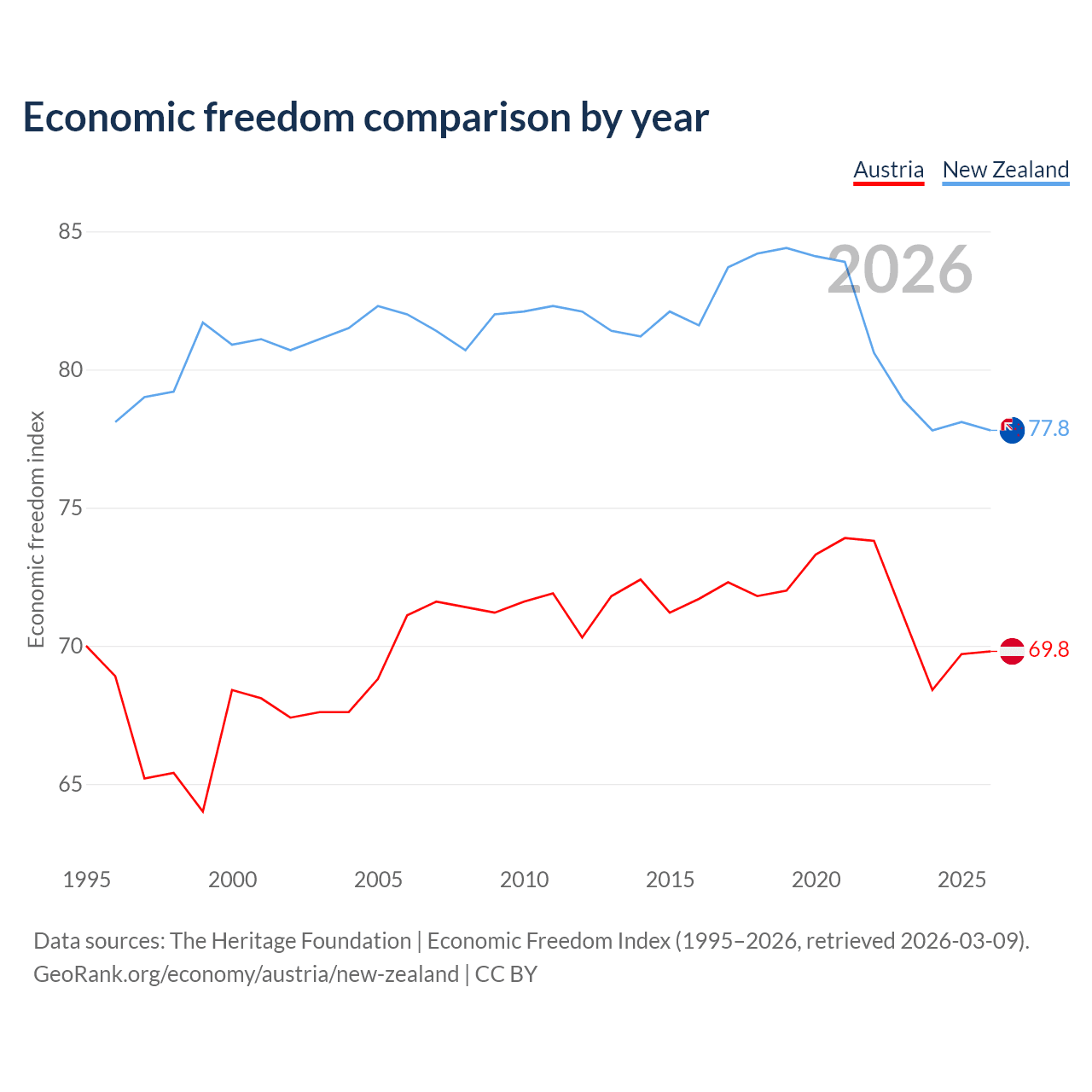 The Economic Freedom Index for Austria is 69.8, ranking 38/197, compared to 77.8 for New Zealand, ranking 13/197. The chart above displays a comparison of annual changes in economic freedom indexes.
