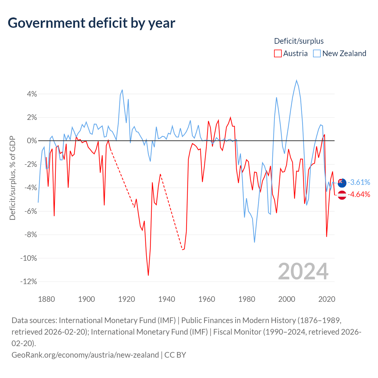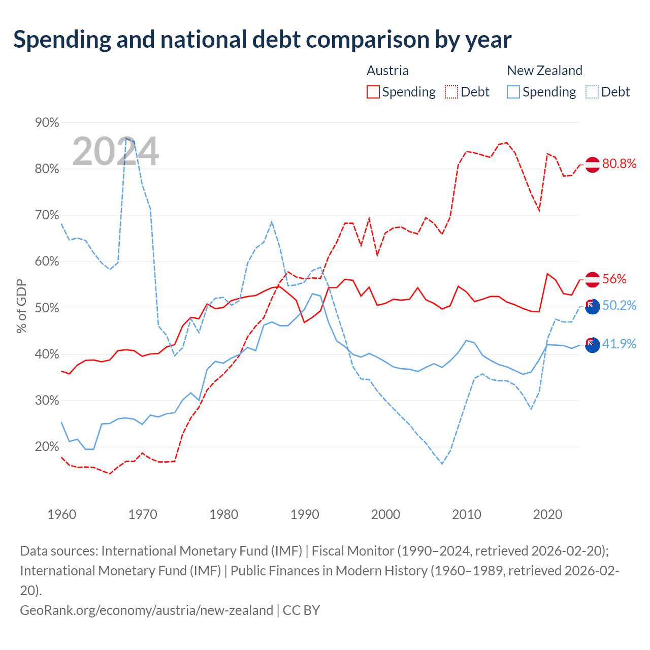 Austria has $432B in government debt (80.8% of GDP), compared to $131B (50.2% of GDP) in New Zealand.