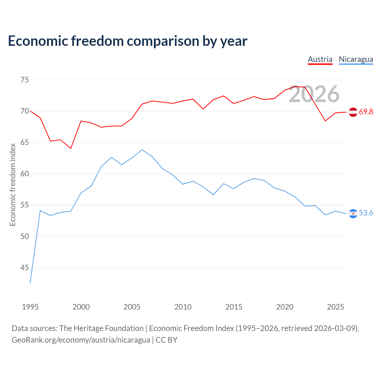Data sources: The Heritage Foundation | Economic Freedom Index (1995–2026, retrieved 2026-03-09).