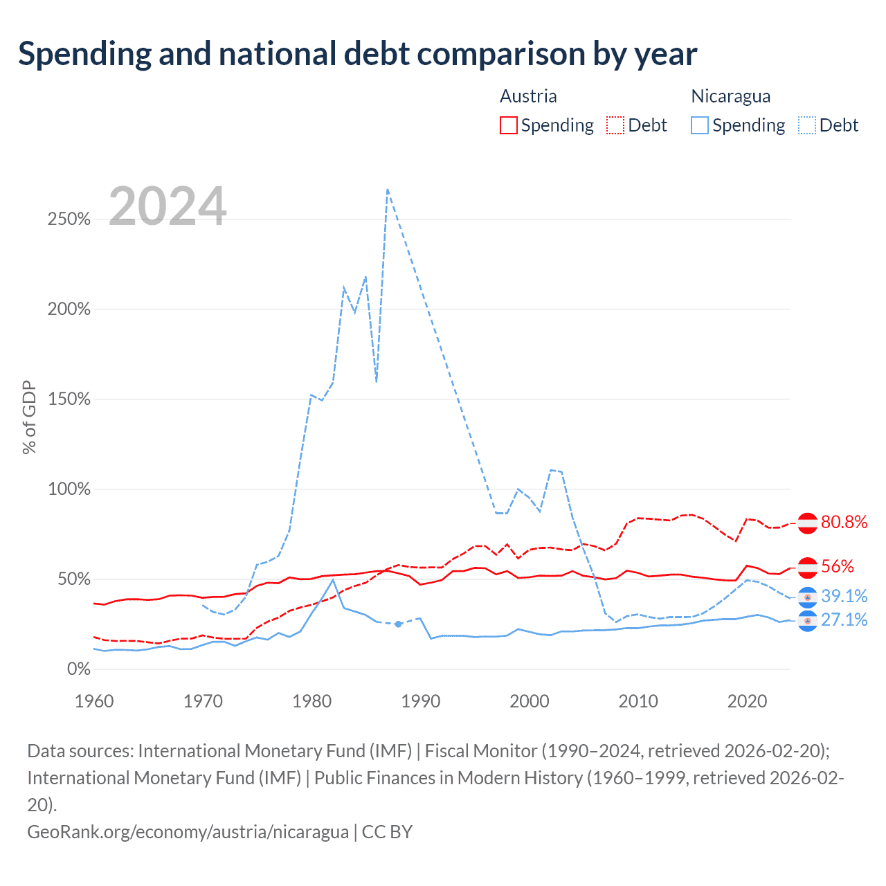 Austria has $432B in government debt (80.8% of GDP), compared to $7.71B (39.1% of GDP) in Nicaragua.