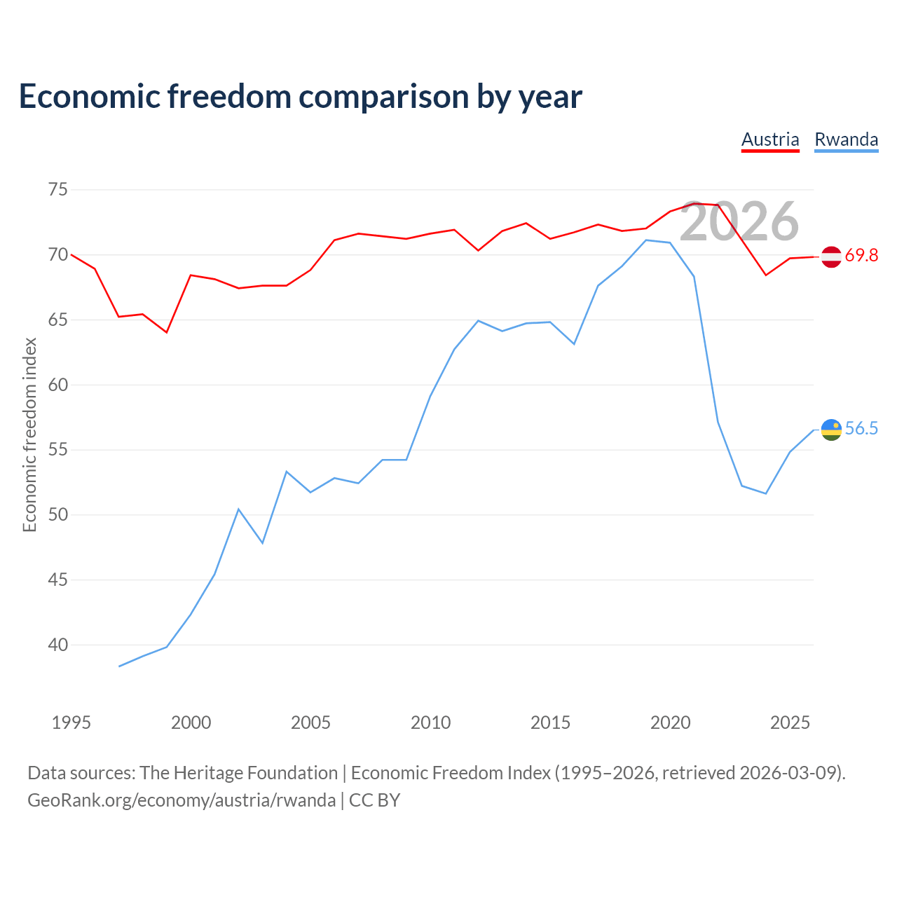 The Economic Freedom Index for Austria is 69.8, ranking 38/197, compared to 56.5 for Rwanda, ranking 121/197. The chart above displays a comparison of annual changes in economic freedom indexes.
