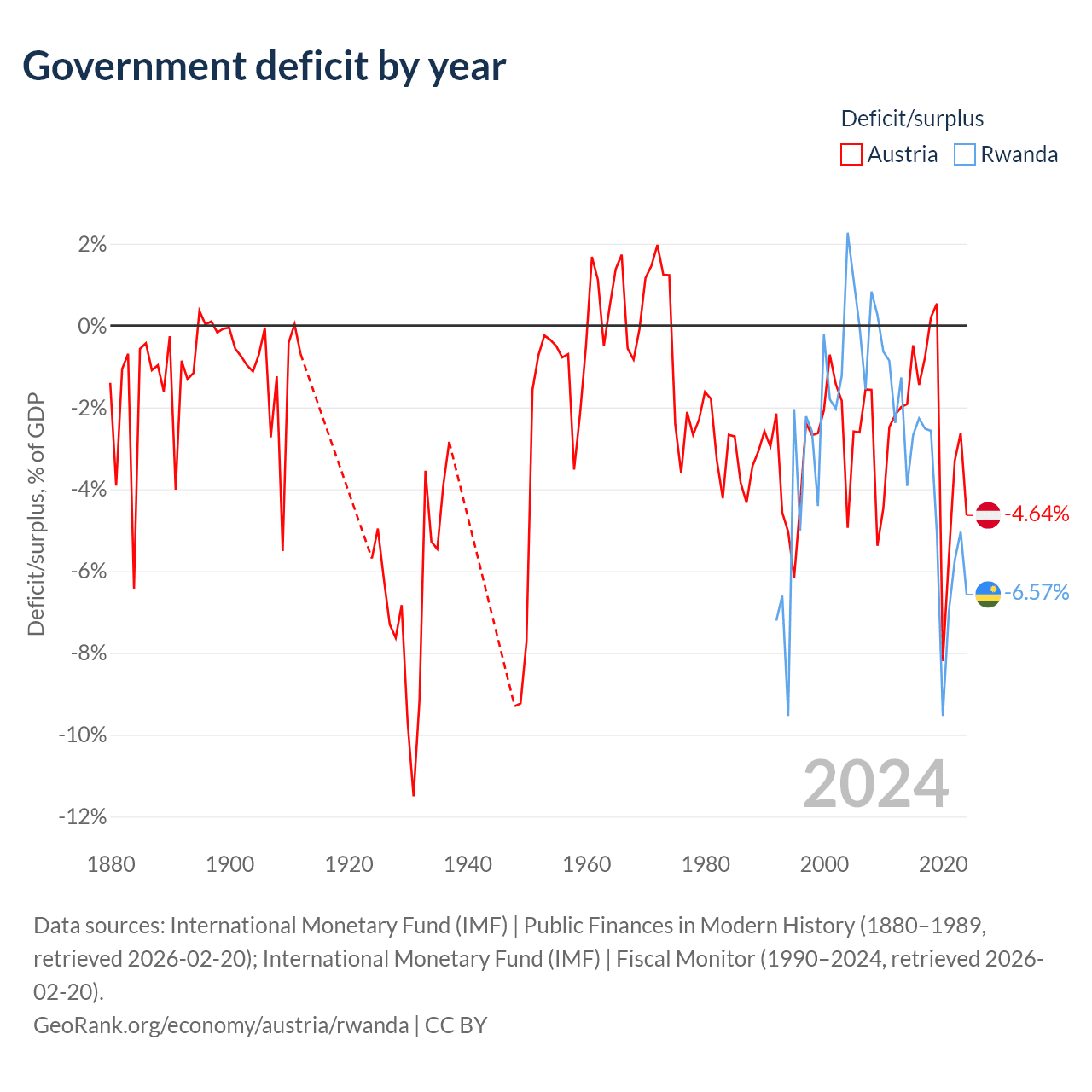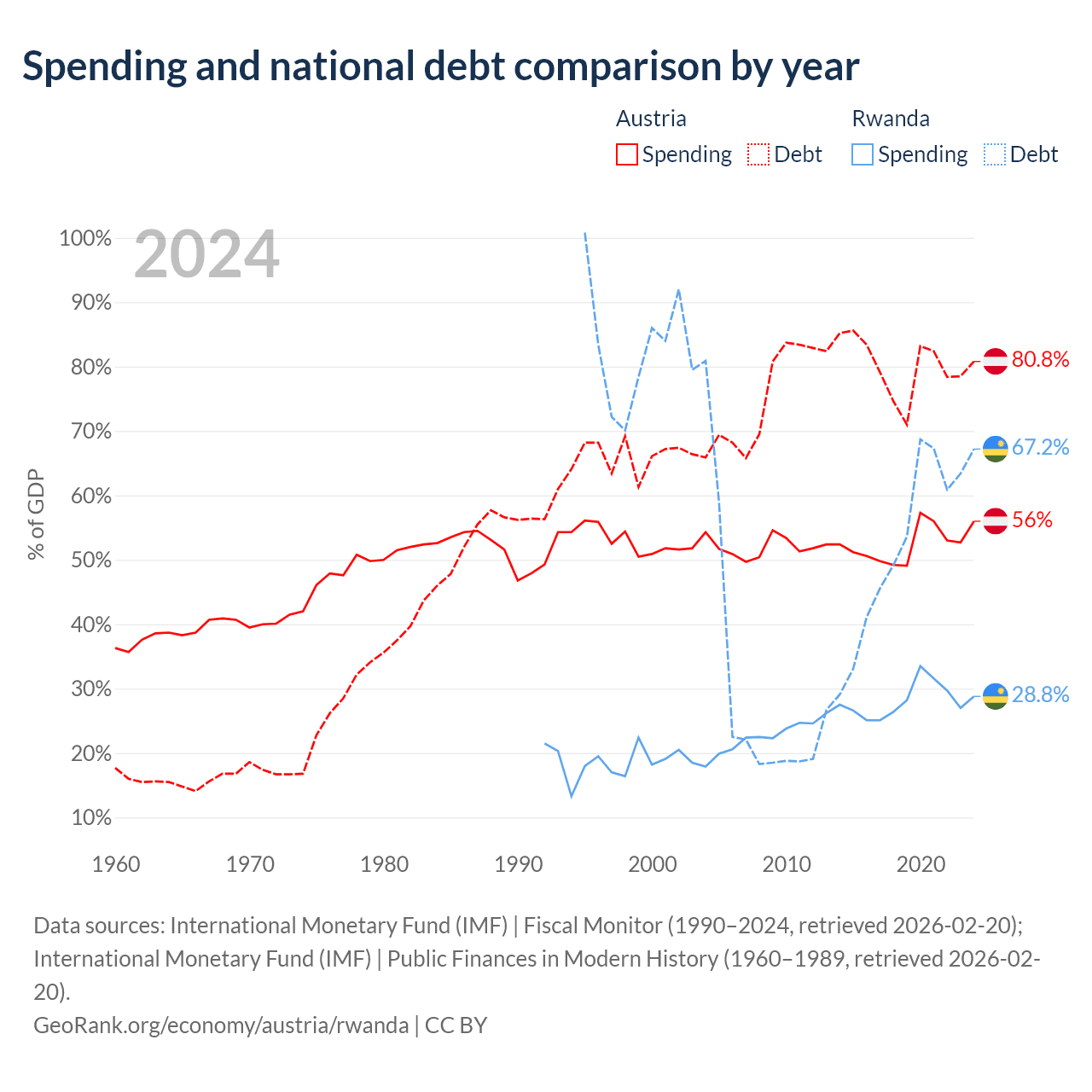 Austria has $432B in government debt (80.8% of GDP), compared to $9.58B (67.2% of GDP) in Rwanda.