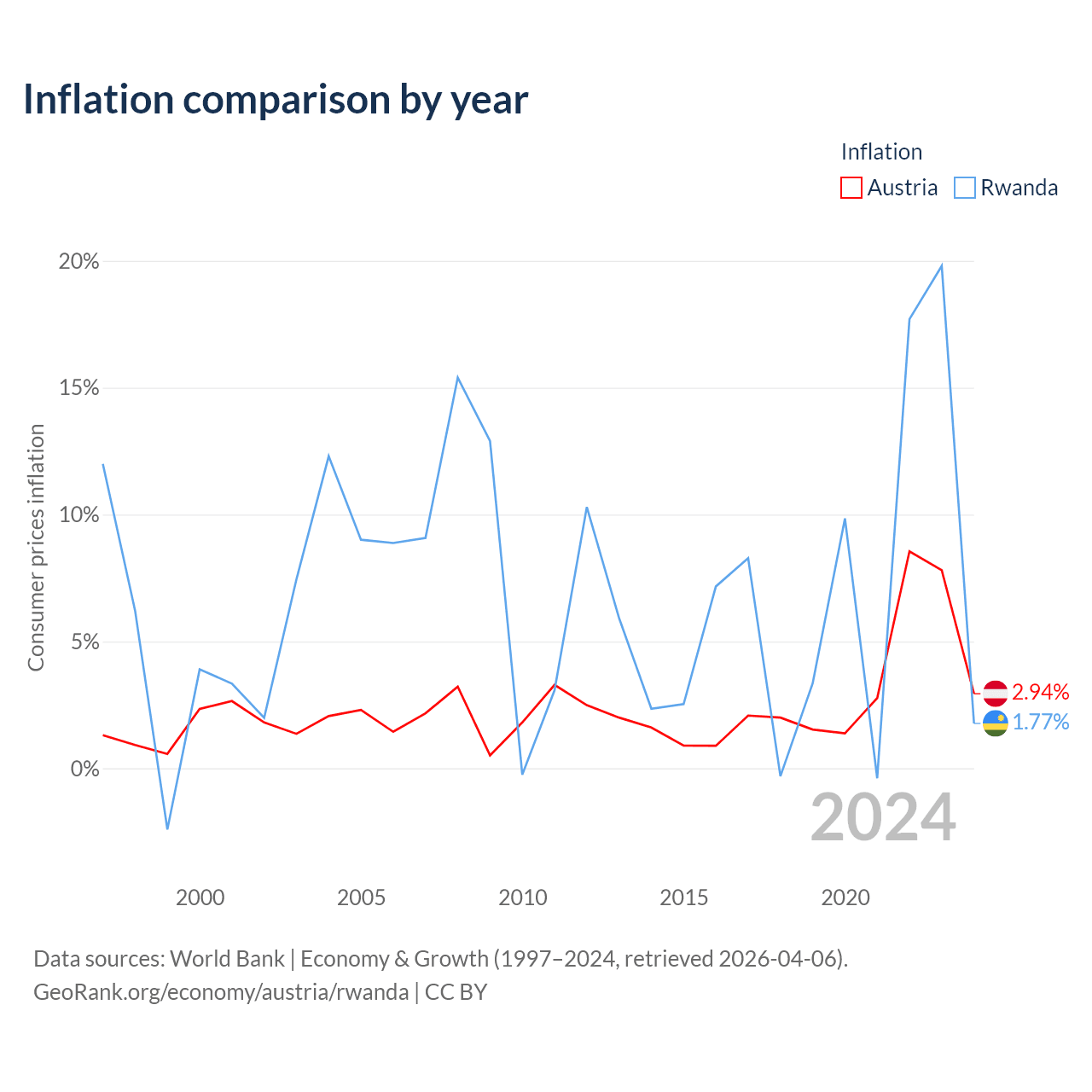 Austria has a GDP of $535B compared to $14.3B for Rwanda, ranking 30/197 and 144/197 by economy size, respectively.