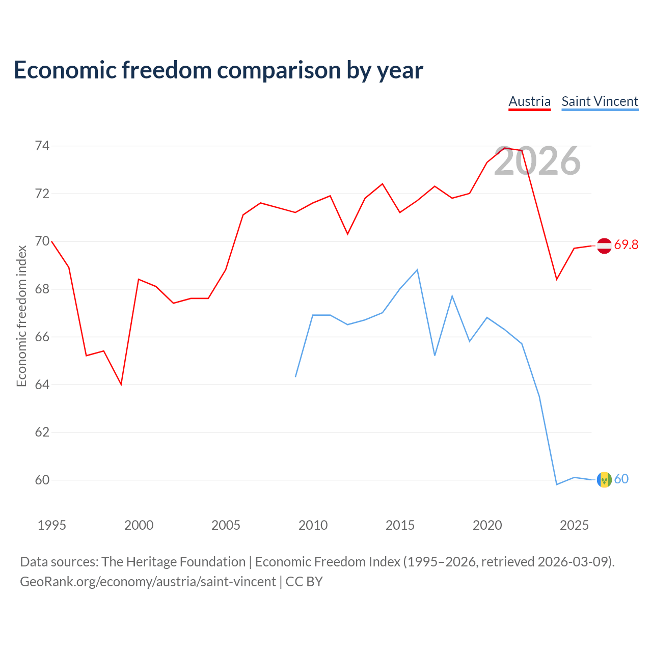 The Economic Freedom Index for Austria is 69.8, ranking 38/197, compared to 60 for Saint Vincent, ranking 98/197. The chart above displays a comparison of annual changes in economic freedom indexes.