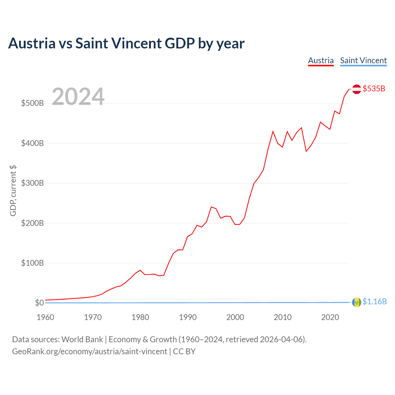 Austria has a GDP of $535B compared to $1.16B for Saint Vincent, ranking 30/197 and 186/197 by economy size, respectively.