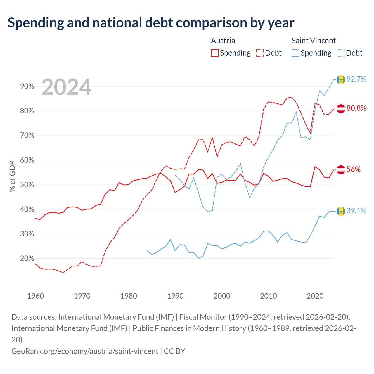 Austria has $432B in government debt (80.8% of GDP), compared to $1.07B (92.7% of GDP) in Saint Vincent.