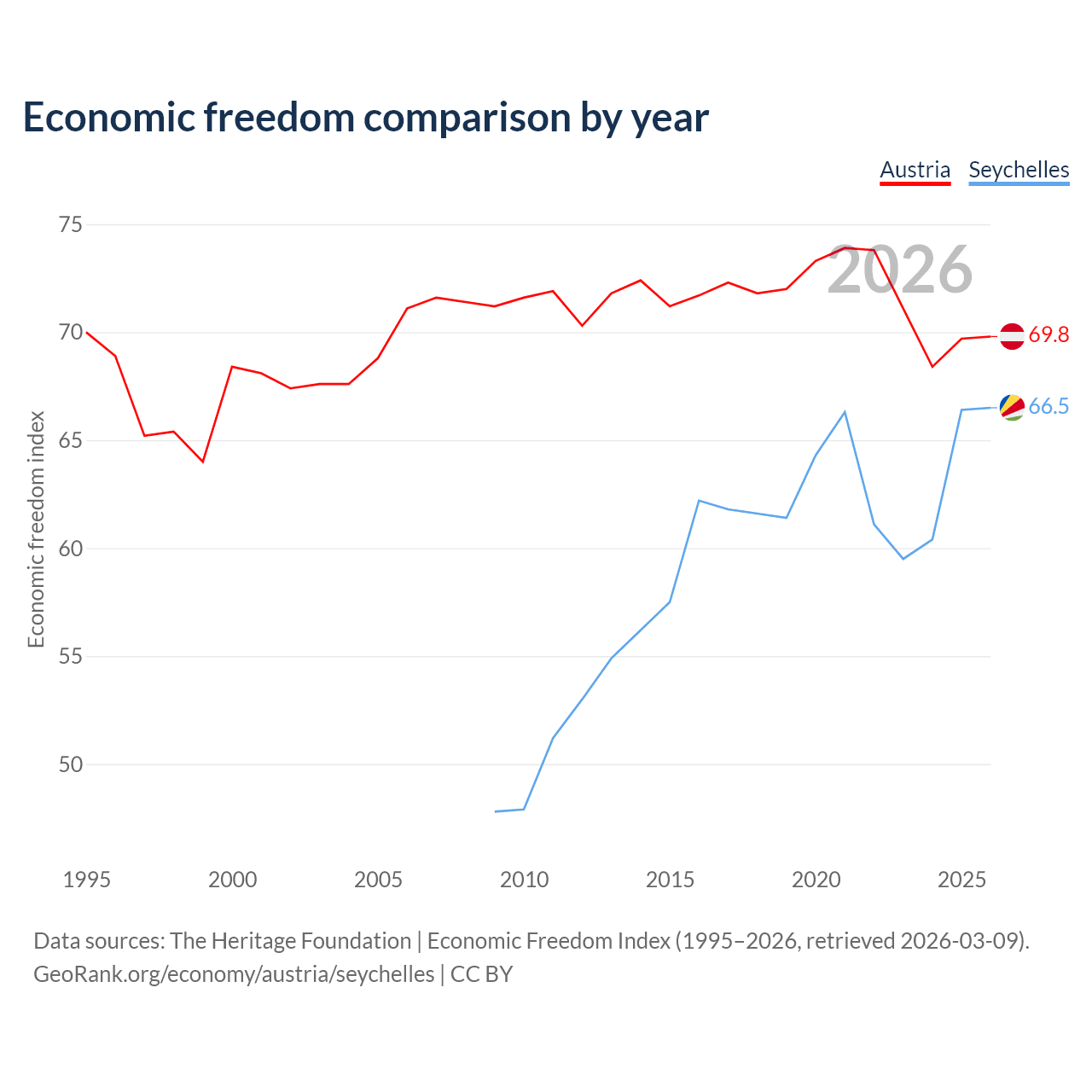 The Economic Freedom Index for Austria is 69.8, ranking 38/197, compared to 66.5 for the Seychelles, ranking 60/197. The chart above displays a comparison of annual changes in economic freedom indexes.
