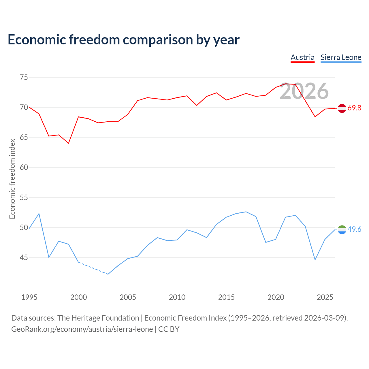 The Economic Freedom Index for Austria is 69.8, ranking 38/197, compared to 49.6 for Sierra Leone, ranking 165/197. The chart above displays a comparison of annual changes in economic freedom indexes.