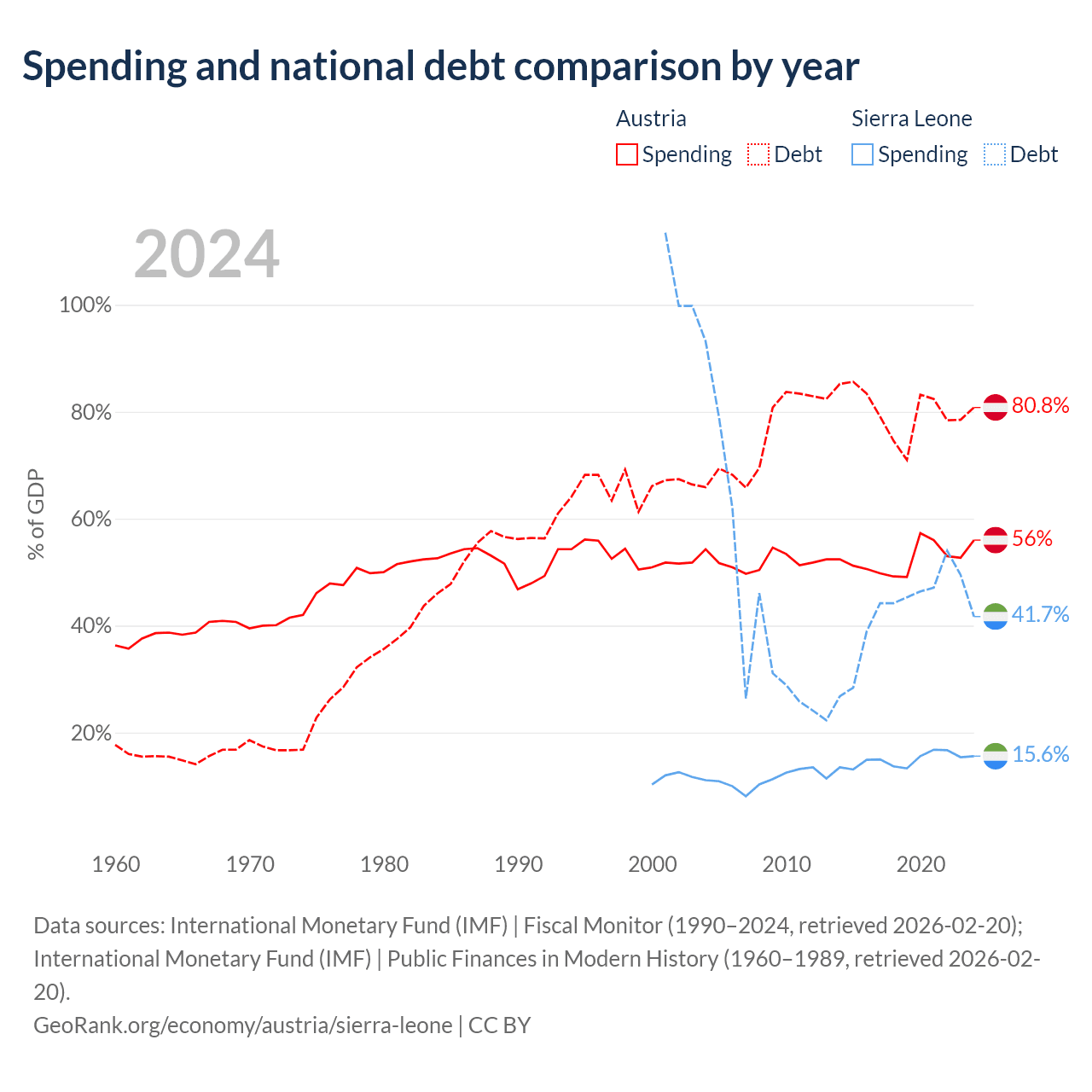 Austria has $432B in government debt (80.8% of GDP), compared to $2.91B (41.7% of GDP) in Sierra Leone.