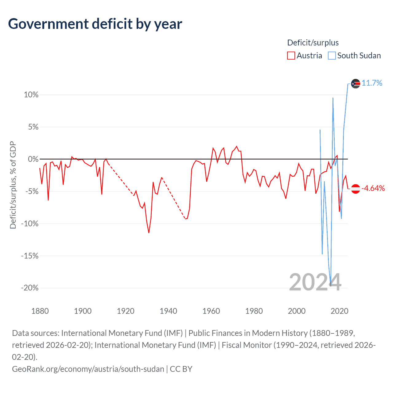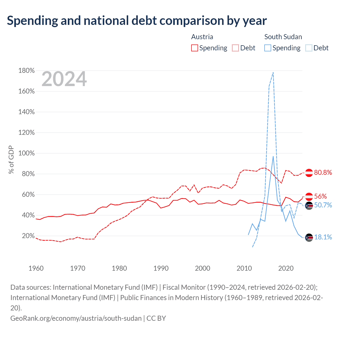 Austria has $432B in government debt (80.8% of GDP), compared to $7.04B (50.7% of GDP) in South Sudan.