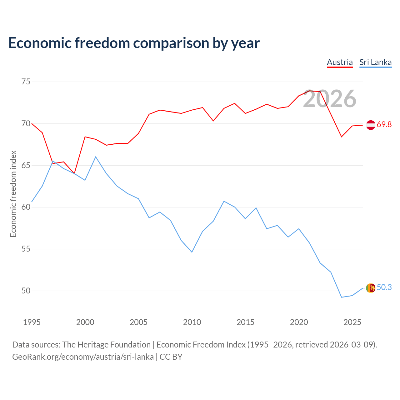 The Economic Freedom Index for Austria is 69.8, ranking 38/197, compared to 50.3 for Sri Lanka, ranking 162/197. The chart above displays a comparison of annual changes in economic freedom indexes.