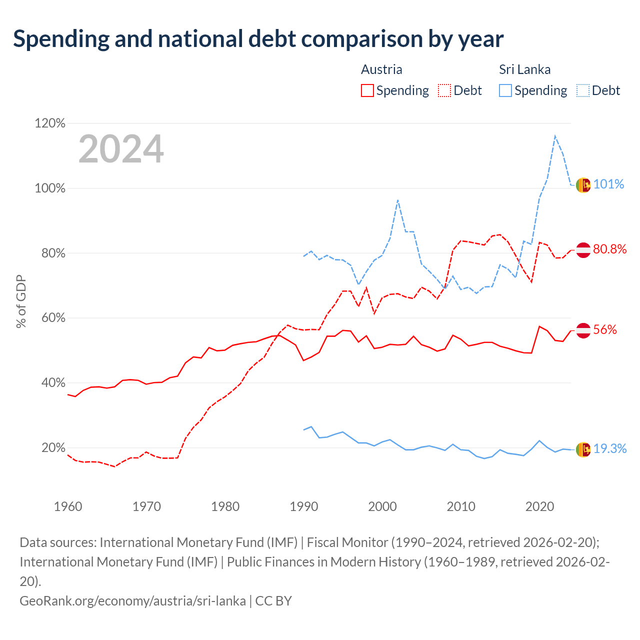 Austria has $432B in government debt (80.8% of GDP), compared to $99.8B (100.8% of GDP) in Sri Lanka.
