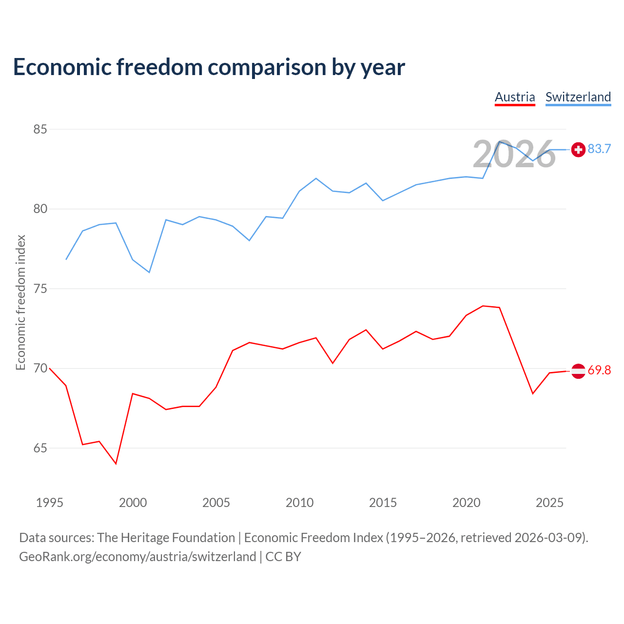The Economic Freedom Index for Austria is 69.8, ranking 38/197, compared to 83.7 for Switzerland, ranking 2/197. The chart above displays a comparison of annual changes in economic freedom indexes.